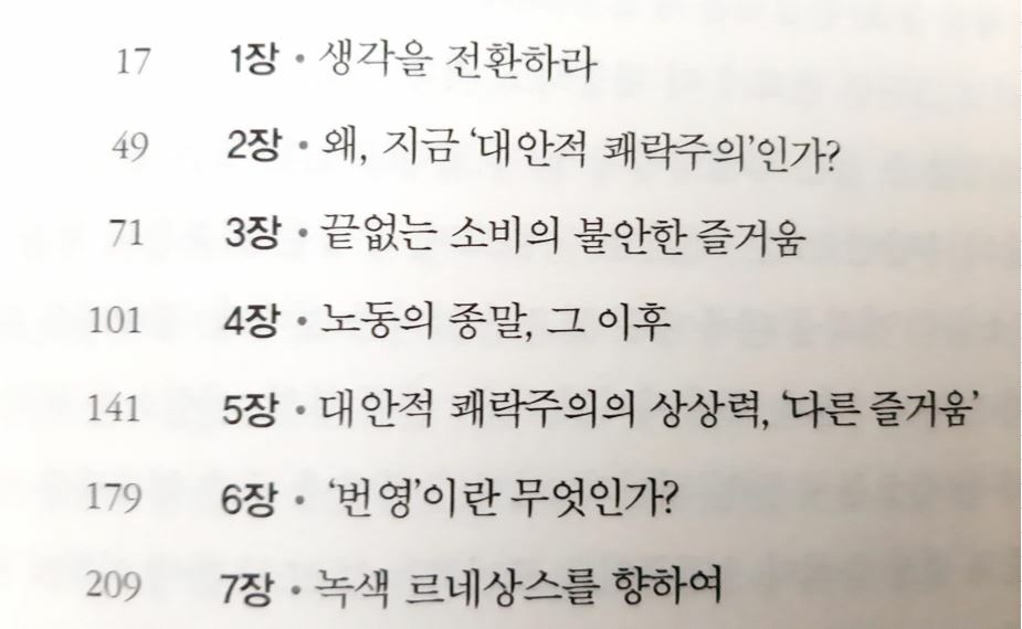 지금도 우리 집에는 쓰레기가 넘쳐나고 있다. 이제는 정말 심각한 문제로 인식하고 받아들여야할 때인 것 같다. 나 하나 바뀐다고 세상이 달라지지는 않겠지만, 적어도 우리 집만은 변화시킬 수 있을 것이다. 이 책은 철학적이고 개념적이라 다소 어렵게 느껴질 수도 있지만, 정말 많은 사람들이 읽어보았으면 좋겠다는 생각이 들었다. 책을 읽고 나서 정말 좋은 주제에 대한 좋은 내용을 읽었다는 뿌듯함이 느껴졌다. 우리 모두의 미래를 더 좋은 삶으로 변화시키기 위해 저자가 주장하는 더 적게 소비하고 더 풍성하게 누리는 ‘대안적 쾌락주의’가 많은 사람들에게 받아들여지고 또한 모든 사람이 귀 기울였으면 좋겠다.