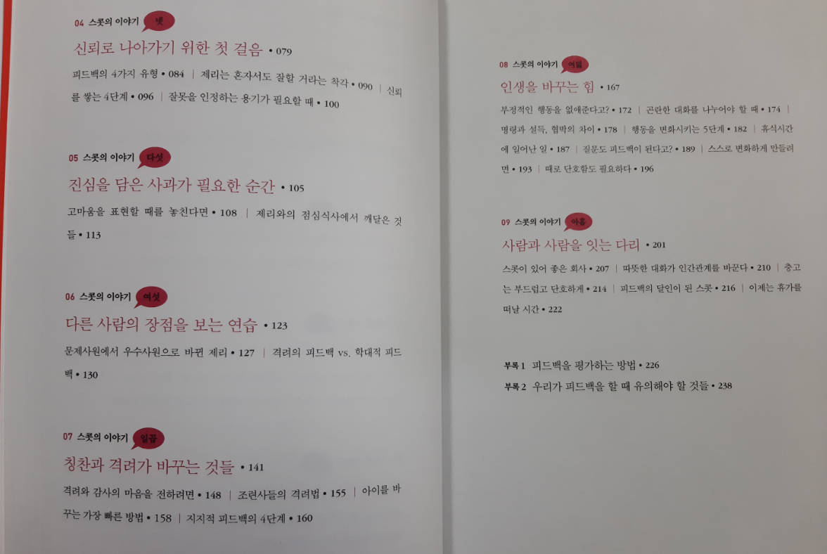 이 책은 우리나라에서 이미 2007년 초판이 발간되어 10만부가 넘게 팔린 책으로 많은 기업에서 조직관리 등에 활용되어 왔다. 좋은 책은 필요에 의해 계속 재발행 되는 것 같다. 저자는 세상 모든 발전과 변화의 중심에는 바로 ‘사람’이 놓여 있으며, 사람과 사람 사이에 형성되는 건강하고 활력에 넘치는 ‘관계’야말로 우리가 인생에서 가장 소중하게 간직해야 할 보석과도 같은 가치이며 그 중심에 ‘피드백’이 있음을 지혜롭고 일러준다.