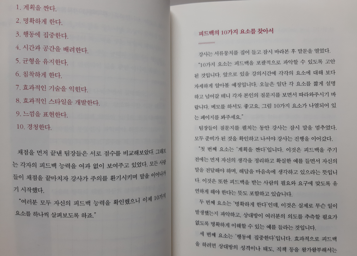 “피드백은 우리 모두에게 중요해요. 피드백은 모든 대인관계의 근원입니다. 피드백은 사람들이 어떻게 생각할지, 어떻게 느낄지, 다른 사람들에게 어떻게 반응할지, 그리고 넓게는 일상적인 책임 범위에서 개개인이 어떻게 행동할 지를 결정해요“ - P26.