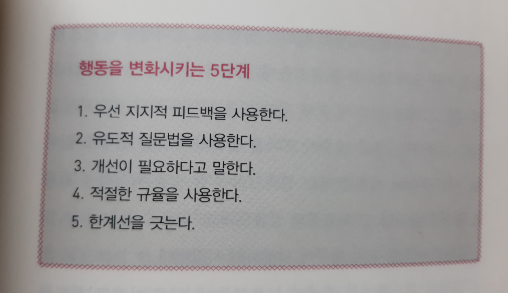 책을 읽으며 특별히 기억나는 부분은 아이를 바꾸는 가장 빠른 방법에 관한 부분이었다. 그동안 행동을 변화시키는 전통적인 방법 명령, 협박, 설득 중에서 내가 아이들에게 주로 사용하던 방법은 명령이었다. 방청소를 하지 않는 아이를 위한 지지적 피드백 4단계 구체적인 행동을 설명한다, 행동의 결과를 설명한다, 행동에 어떻게 느꼈는지 설명한다, 왜 그렇게 느꼈는지 설명한다를 우리 아이들에게도 꾸준히 실행해봐야겠다.