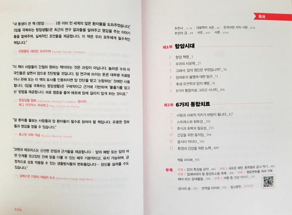 암에 걸렸을 때 막연한 두려움과 공포로 인해 실의에 빠진 분을 뵌 적이 있다. 실제로 암 환자의 90%는 우울·불안 등 심리적 어려움 겪는다고 한다. 또한 병원에서 표준치료를 받다가 포기하고, 대체 요법으로 치료를 받는 분들도 있다. 절박함과 간절함에 무엇이라도 시도하고 싶은 환자의 심정일 것이다. 이 책은 현재 표준치료를 받는 암 환자에게는 증상 완화와 삶의 질 개선을 위한 내용을, 치료를 마친 환자에게는 전이 재발을 방지하기 위해 꼭 필요한 내용이 담겨 있다. 암에 대한 막연한 생각과 답답한 마음이 드는 분들에게 이 책은 과학적이고 체계적이며 실질적인 도움을 줄 수 있을 것이다. 하루빨리 암이 죽음의 불치병에서 만성질환으로 그리고 치료 가능한 성인병으로 바뀌어 여러 사람이 더 오래 살 뿐만 아니라 더 보람있게 살았으면 좋겠다.