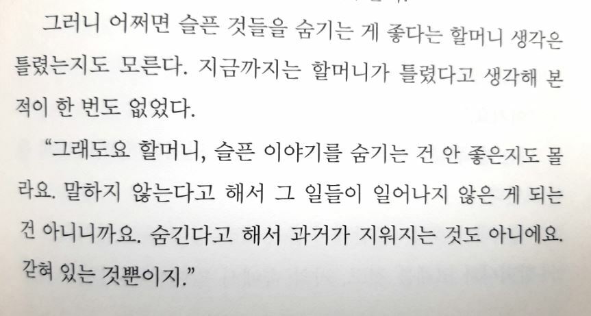 어릴 적 아버지의 죽음으로 인해 마음의 상처를 간직한 채 살아왔던, 무뚝뚝해보이던 언니 샘이 할머니를 지키기 위해 남몰래 쌀을 뿌리러 다니던 행위는 솔직히 반전이었다. 샘은 마음속에 가둬 둔 고통과 슬픔을 드러내며 말한다. “이걸 또 겪어야 하는 게 너무 싫어. 떠난 사람은 기억 속에 산다고 하는데, 전부 기억할 순 없고, 기억을 지키지 못하면 그걸로 영영 끝인 거야. 사랑했던 사람이 없어지는 거야.” 하지만 할머니의 마지막 말은 매우 인상적이다. “그런데 내 이야기를 꼭꼭 숨기니까 그 이야기가 날 잡아먹었어. 그래서 사랑이 안 보였어. 내 주위에 사랑이 가득한데.” 그리고 이어 말한다. “때로 가장 강한 일은 도망을 그만 가는 거야. 나는 호랑이 안 무섭다, 나는 죽는 거 안 무섭다, 말하는 거야.”