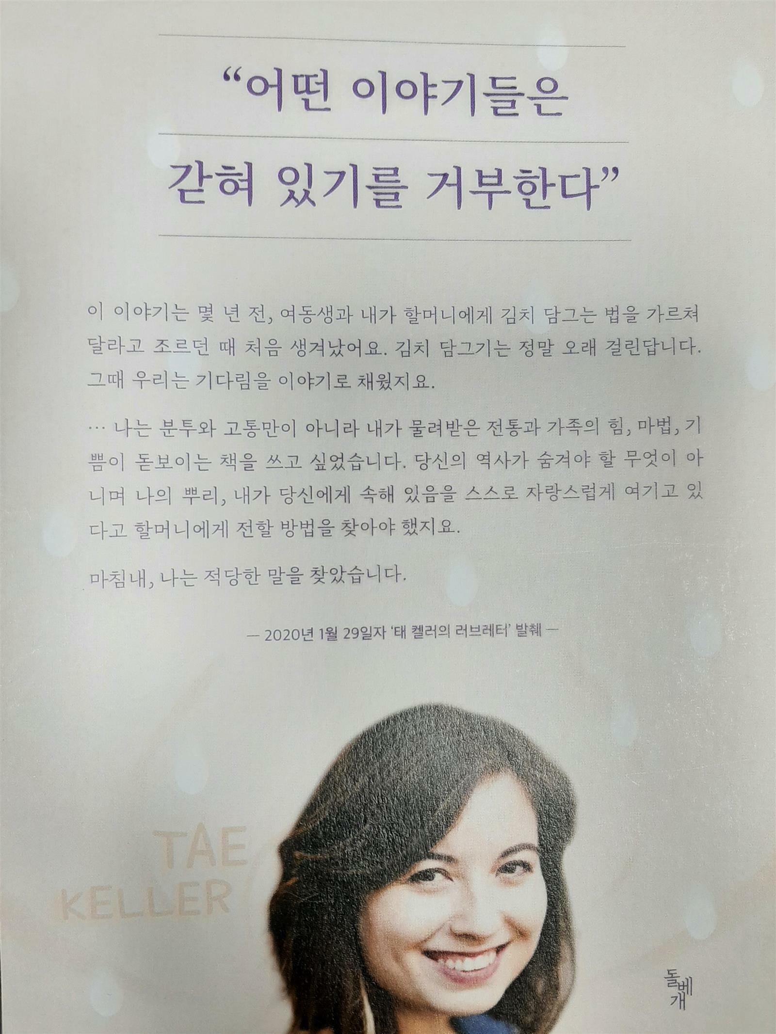 2021 뉴베리상 수상작, 한국계 작가의 한국 할머니 대한 이야기, 어떤 호랑이와 관련된 이야기가 펼쳐질지에 큰 호기심과 기대를 하며 『호랑이를 덫에 가두면』을 읽어 보았다. 이 책의 저자는 태 켈러(Tae Keller)이다. 호놀룰루에서 태어나, 그곳에서 보라색 잡곡밥과 스팸 무스비를 먹고 할머니(halmoni)의 호랑이 이야기들을 들으며 자랐고, 지금은 시애틀에서 살고 있다고 한다. ‘태’(Tae)라는 이름은 할머니의 이름 ‘태임’에서 첫 글자를 따서 지었다고 한다. 할머니에 대한 존경과 사랑이 느껴진다. 지은 책으로는 『깨지기 쉬운 것들의 과학』이 있다.
