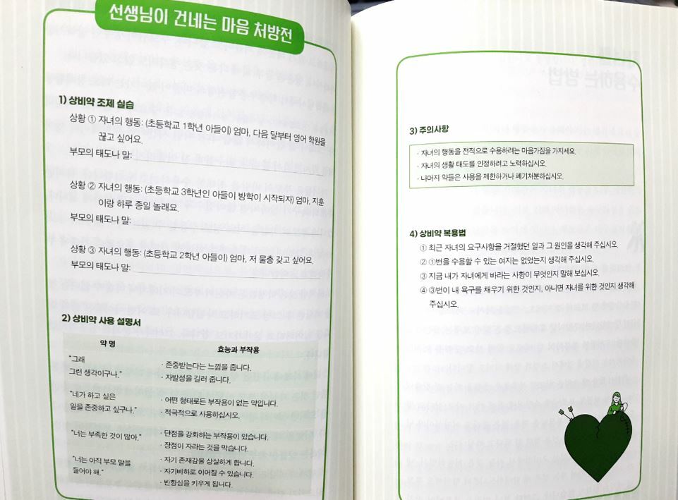 책에서는 실제 상담현장에서 경험한 실례를 보여주고 그 상황에 맡는 설명과 마지막에 건네는 선생님의 마음 처방전을 제시하고 있는데 자녀 교육 지침서로서 매우 유익하고 유용하다고 생각되었다. 실제로 내가 아이와 갈등을 빚고 있는 여러 가지 문제들을 생각하면서 2장 자녀 양육을 위한 제언을 읽었는데, 선생님이 건네는 마음 처방전을 정리하면서 아이를 이해하고 그 행동을 수용하는데 많은 도움이 되었다. 특히, 늘 내 마음 상태를 점검하고 불편한 감정이 일어날 때 그 원인을 내안에서 찾으라는 말이 기억에 남는다.