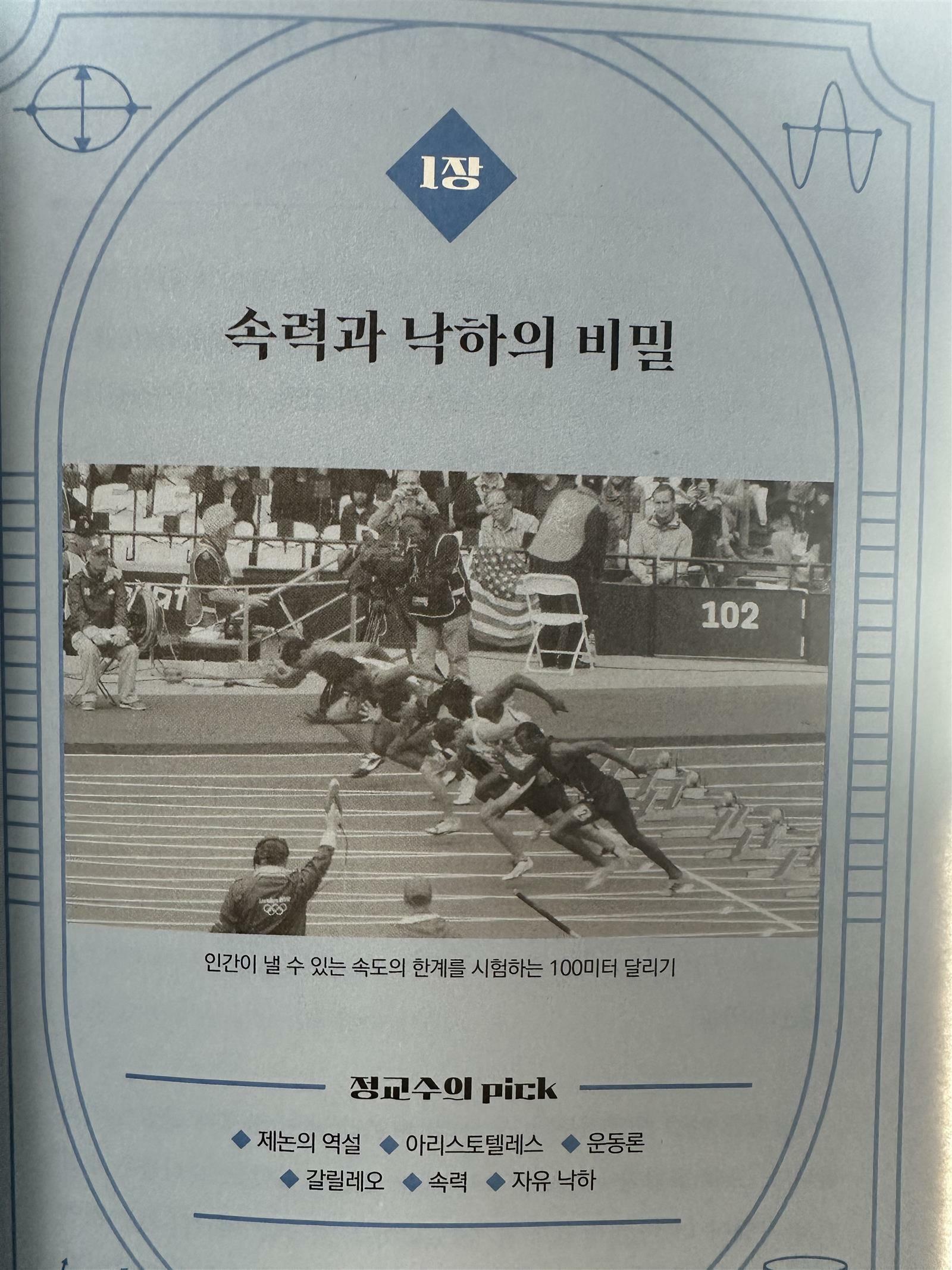 가장 먼저 다루는 주제는 '속력과 낙하의 비밀'이다. 교과서에서도 종종 등장하는 '제논의 역설'로 알려진 '아킬레우스와 거북이' 이야기가 먼저 등장한다. 제논은 아킬레우스가 영원히 거북이를 따라잡을 수 없을 거라 생각했다. 아킬레우스가 100미터를 달려가면 거북이는 10미터를 이동하고, 거북이를 따라잡기 위해 아킬레우스가 10미터를 이동하면 거북이는 1미터를 이동한다. 이 과정을 무한히 반복하면 아킬레우스는 계속 거북이가 있던 자리에만 도착하게 되고, 거북이를 절대 따라잡을 수 없다고 주장한다.