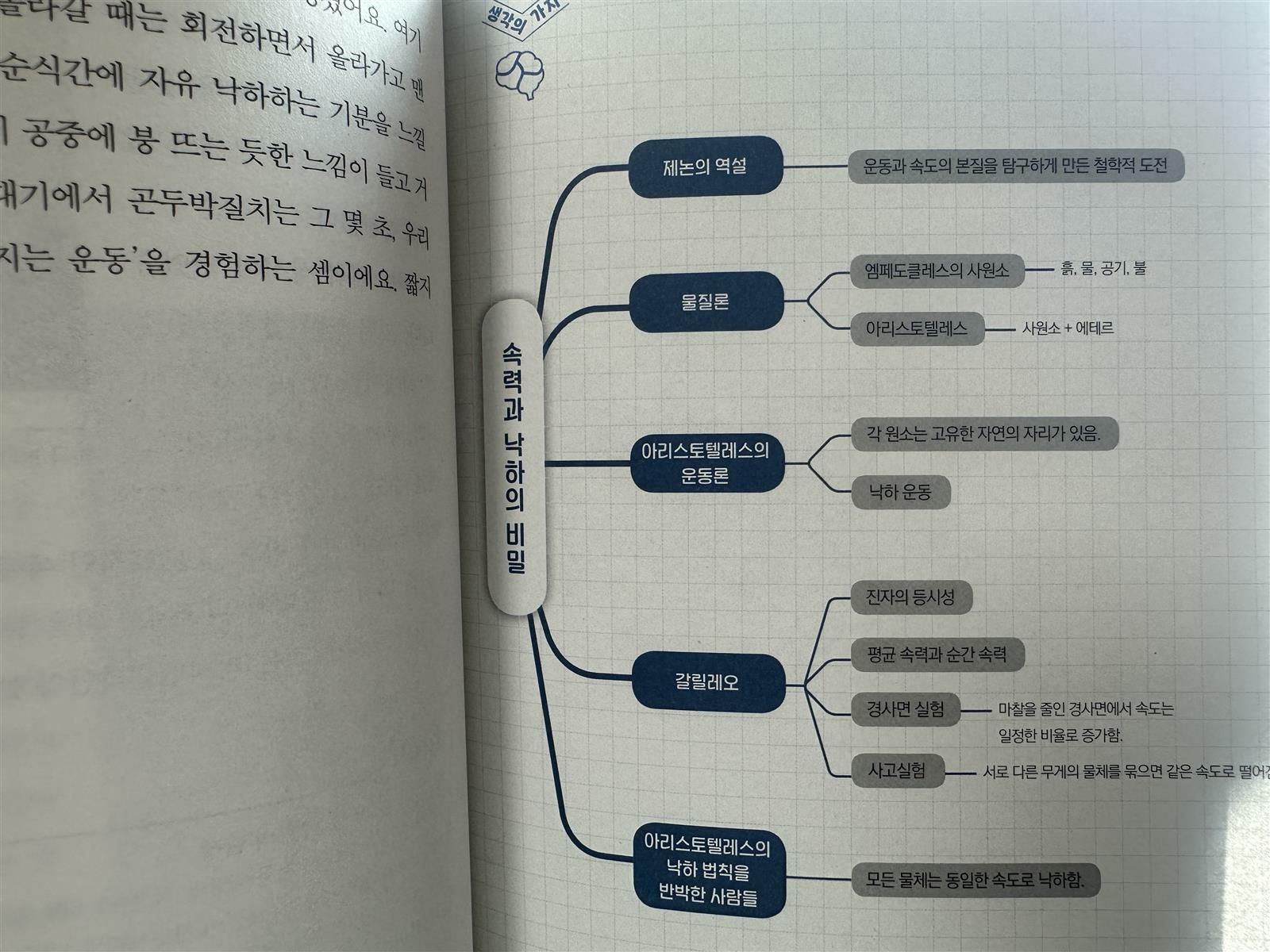 <생각하는 청소년을 위한 물리학의 역사>에서는 한 챕터가 끝나면 책에서 주로 다룬 내용을 깔끔하게 볼 수 있도록 도식으로 정리해 놓았다. 물리학 주제 위주로, 앞에서 언급했던 주요 사건을 써 놓았기 때문에 관련된 물리학 내용과 공식 등을 효율적으로 복습할 수 있다. 또한 물리학을 공부하지 않는다 하더라도 국어 수능 대비 비문학으로 자주 보는 과학 주제들이 나와 있다. 파동의 성질, 도플러 효과, 뉴턴의 중력 발견 과정, 위치에너지, 유체역학, 빛의 입자설과 파동들 등 모두 단골 출제 내용이다.