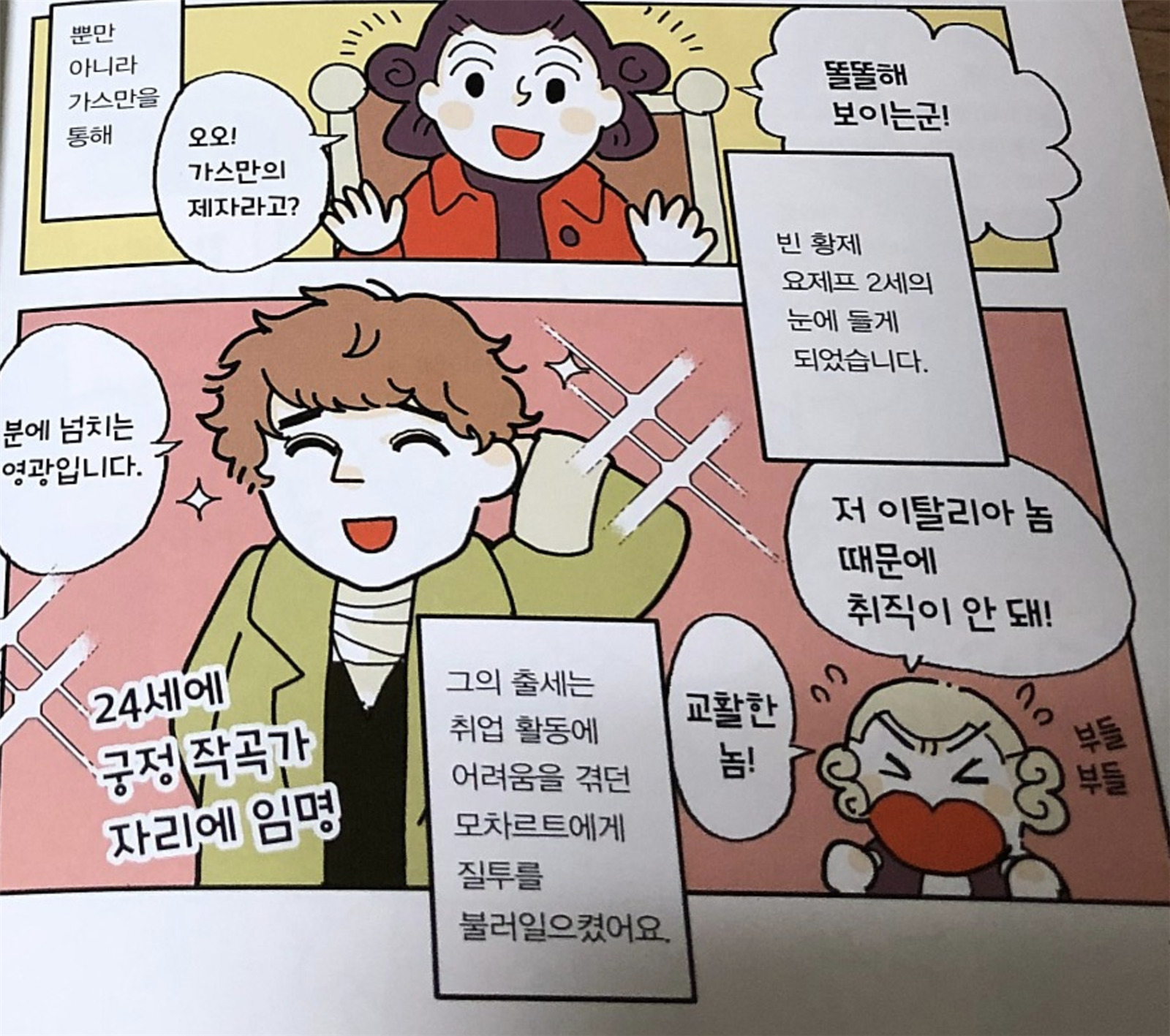 일단 이 책을 쓴 작가는 위트가 넘치는 사람임에 분명하다. 그리고 글을 옮기신 분도 그 원작의 느낌을 잘 살리신 것 같다. 12명의 작곡가를 시대별로 그리고 시대 순으로 설명하고 있다. 각 작곡가에 대한 내용을 만화로 설명하고 그 이후 각 작곡가에 대한 내용을 글로 설명하고 있다. 그런데 만화의 내용들이 너무나도 재미있다. 흥미롭게 읽다보니 책 한권이 순식간에 읽혀졌다.