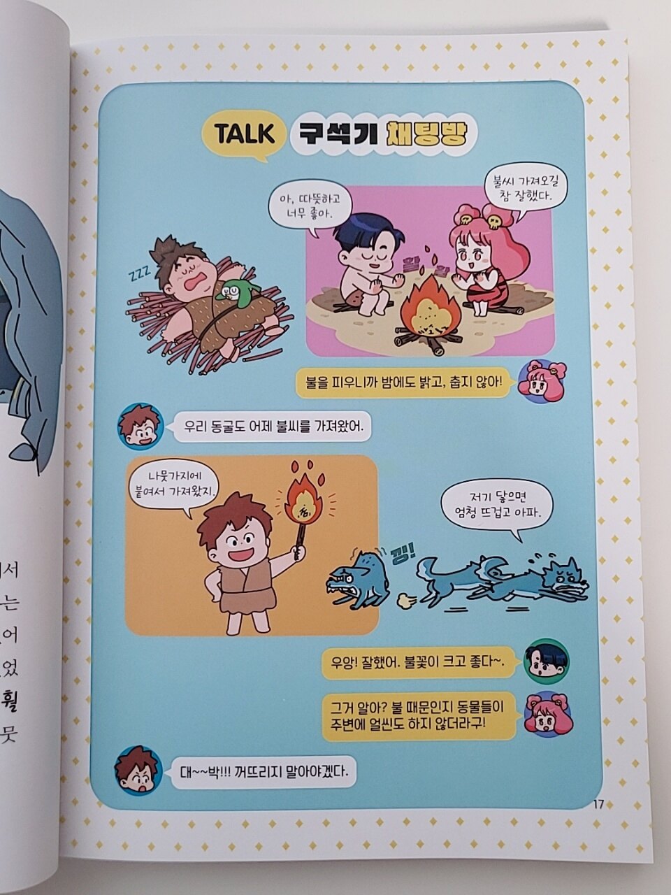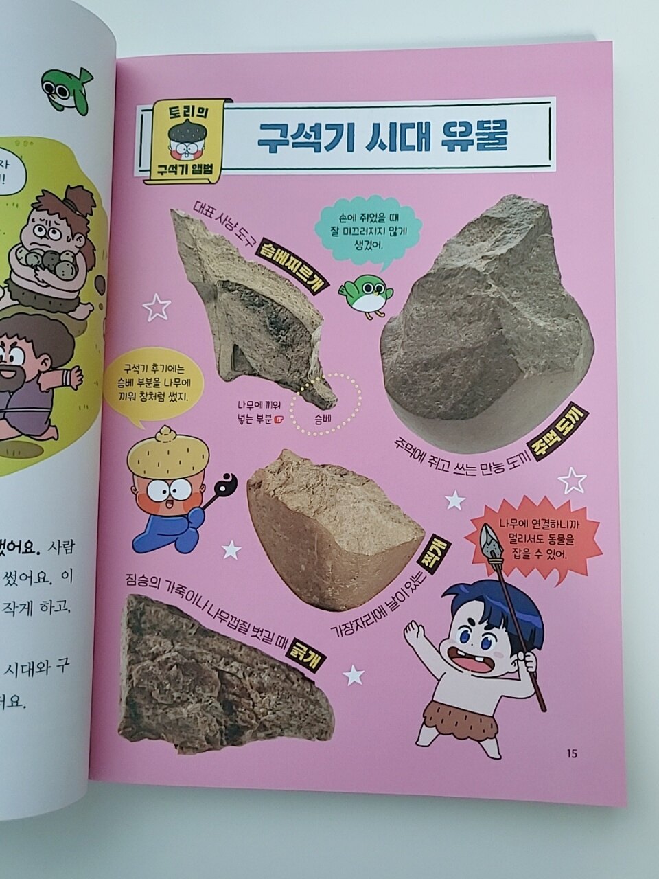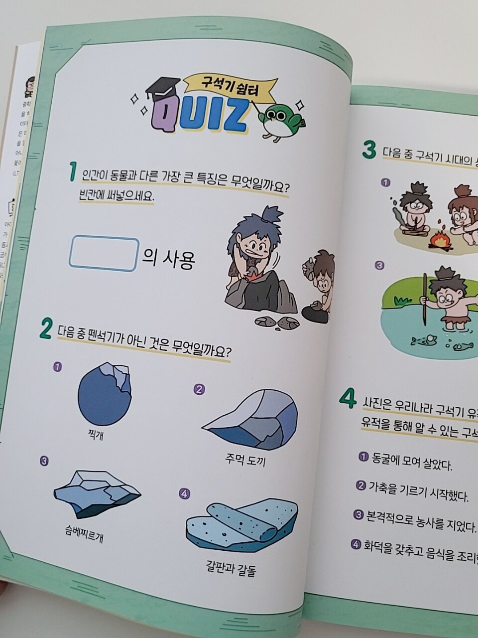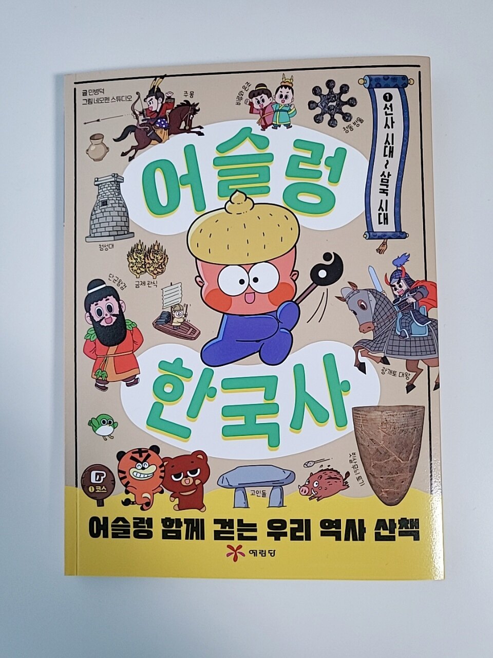 아이에게 역사를 처음 접하게 해줄 때 가장 고민되는 부분은 바로 흥미인 것 같아요. 내용은 탄탄하면서 재미까지 잡은 부담 없이 산책하듯 역사를 배울 수 있는 책!! 어슬렁 한국사를 소개시켜드리려고 해요. 책을 펼치면 도깨비 토리, 호랑이 슬렁이, 곰 곰디 등 친근한 캐릭터들이 등장해요. 이 친구들이 시간 여행을 떠나는 내용이라 아이가 직접 그 시대에 들어간듯이 자연스럽게 역사 속으로 빠져들 수 있었어요. 글밥이 너무 많지않고 그렇다고 만화로만 채워져 있지도 않아 초저 아이가 읽기에 딱이고요. 아이들의 눈높이에 맞는 쉬운 설명과 재미있는 그림 덕분에 아이가 재미있게 읽더라구요. 실제 유물 사진과 함께 상세한 설명이 곁들여져 있어 귀중한 유산도 배워나갑니다. 얼마전 강화도 박물관에서 본 주먹도끼를 만나서 너무 반가워하더라구요ㅎㅎ 이 책에서 가장 재미 있던 부분은 바로 역사톡!! 요즘 아이들에게 익숙한 방식으로 역사적 사건을 대화로 풀어내는데 불을 발견했을 때의 상황을 친구들과 톡 하듯이 읽어주니 아이가 깔깔 웃더라고요. 시대가 끝날때마다 나오는 쉼터퀴즈도 빼놓을 수 없죠. 앞서 읽은 내용을 가볍게 복습할 수 있는 문제들로 어렵지 않아서 아이가 스스로 풀면서 성취감도 느끼고 다시 한번 핵심키워드를 기억하게 해주었어요. 책 뒤편에는 아이들이 제일 좋아하는 스티커가 가득! 보물 찾기에서 해당하는 유물 스티커를 찾아 붙이는 활동을 할 수 있어요. 역사를 처음 시작하는 초등 저학년에서 입문용으로 너무 좋은 예림당 어슬렁 한국사!! 억지로 외우지 않아도 캐릭터를 따라가다 보면 역사의 큰 흐름을 익히게 되서 좋았어요😊