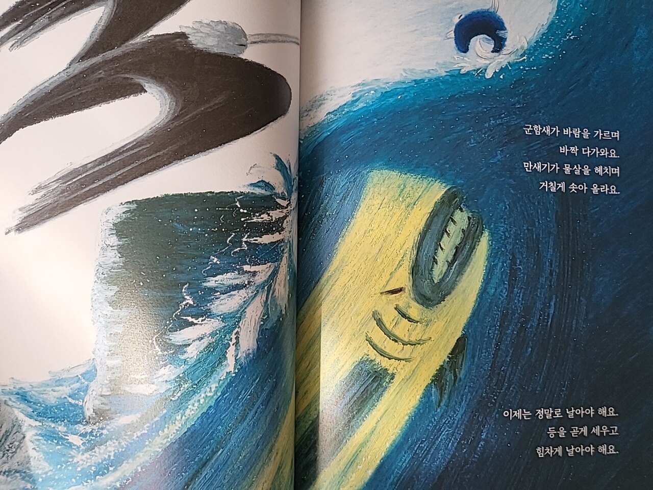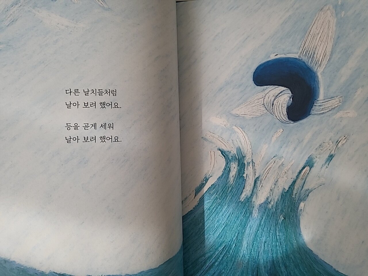[출판사로부터 도서 협찬을 받았고 본인의 주관적인 견해에 의하여 작성함] 요즘 아이들 그림책을 보면 어른인 제가 더 감동을 받을 때가 많은데요. 오늘 소개할 삐딱이 날치라는 책도 바로 그런 경우였어요. 몽환적인 그림과 따뜻한 메시지가 마음에 오래 남았답니다. 이 책의 주인공은 이름처럼 등이 굽어 삐딱하게 달리는 삐딱이 날치예요. 다른 날치 친구들과 달리 헤엄치지도 날지도 못하고 삐딱삐딱 달려요. 삐딱이 날치는 다른 날치들처럼 등을 곧게 펴고 날아 보려했지만 빙그르르 빙그르르 뒤집혔어요. 날치는 헤엄치고 날아야한다는 평범함을 요구하는 주위의 시선이 조금 짠하게 다가왔지만 우리의 삐딱이 날치는 달릴수 있어 다행이라고 생각해요. 군함새와 만새기가 나타나면서 위기가 찾아오고 정말로 날아야만 하는 순간이 왔어요. 날수없는 삐딱이 날치는 자신만의 방법으로 위기를 해결해나갑니다. 다른 사람과 다르다는건 단점이 아니라 개성!! 지금 너의 모습 그대로도 좋아! 다르다는건 틀린게 아니야! 씩씩한 삐딱이 날치를 보며 우리 아이들 모두 각자의 특별함을 지닌 삐딱이들이 아닐까하는 생각을 했어요^^ 우리아들 다르게 빛나렴!