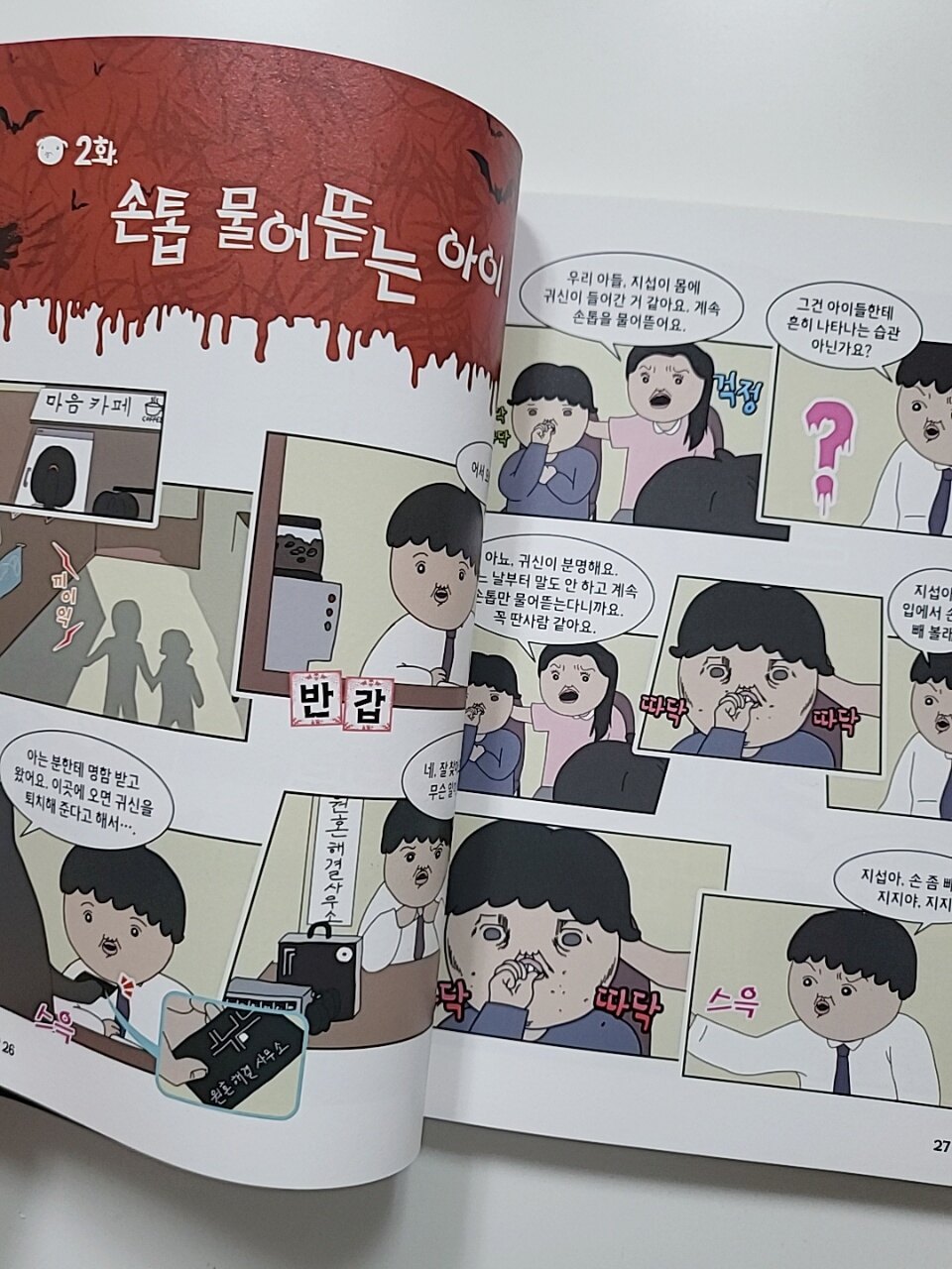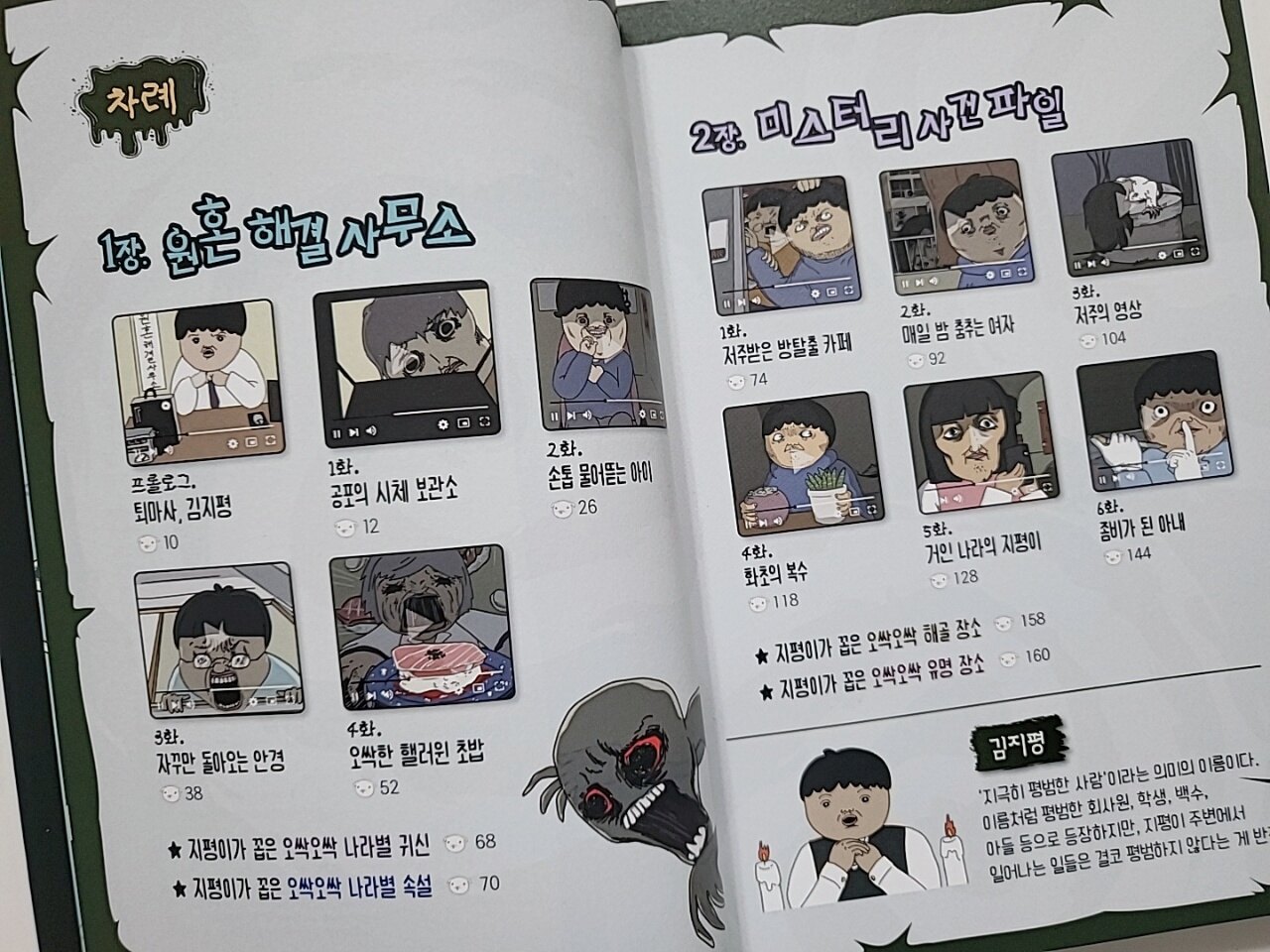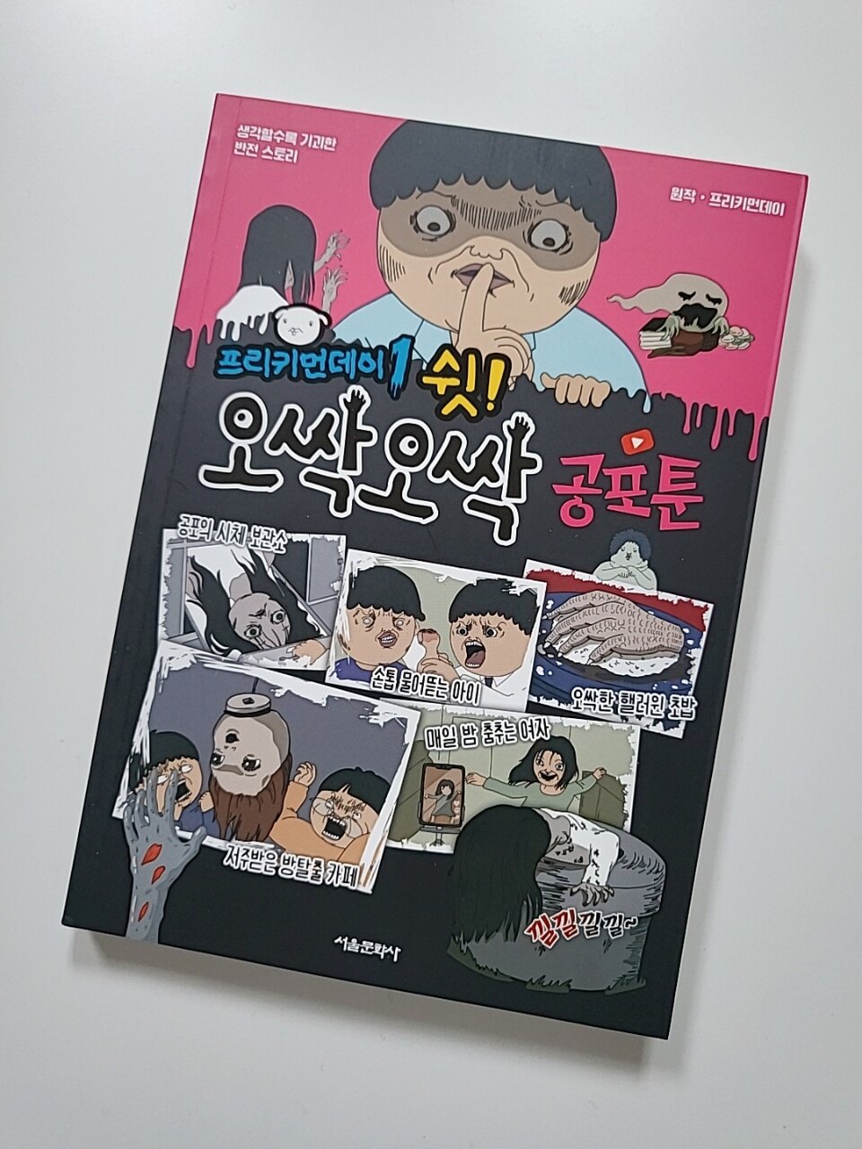 [출판사로부터 도서 협찬을 받았고 본인의 주관적인 견해에 의하여 작성함] 저희아이는 유튜브 공포채널을 자주 보는데요. 특히 생각할수록 기괴한 반전 공포스토리를 참 좋아해요. 즐겨보던 공포 애니메이션 채널 프리키먼데이의 이야기가 책으로 나왔다고 해서 바로 만나봤습니다. 프리키먼데이는 이름처럼 기괴하고(Freaky) 오싹한 이야기를 월요일(Monday)마다 애니메이션으로 선보이고 있어요. 가족이나 친구간의 사랑과 우정을 다룬 이야기는 물론 반전의 반전을 거듭한 이야기까지 탄탄한 스토리와 기획력을 갖춘 공포 애니메이션 채널입니다. 이 책은 주인공 퇴마사 김지평을 중심으로 명함을 건네고 귀신 퇴치 특별주문을 외우면 상담이 시작됩니다. 10개의 등골의 서늘해지는 에피소드들과 나라별 귀신, 속설, 장소 등 정보도 담고 있어요. 책을 펼치면 바로 공포툰이 시작됩니다. 유튜브 애니메이션의 그림체와 말투를 그대로 옮겨와서 친숙한 느낌이 들었어요. 따닥 따닥, 스윽 같은 효과음을 글씨로 표현하여 공포감 up!! 공포와 개그의 콜라보~공포인가 했는데 개그인가 했는데 다시 공포~ 반전이야기에 소름이 돋았어요. 김지평 퇴마사의 귀신 퇴치법에 웃고 갑니다ㅎ 이야기 중간중간 공포 정보도 담겨있어서 잠시 쉬어가며 상식을 넓히는 재미도 있었어요. 프리키먼데이 1 : 쉿! 오싹오싹 공포툰은 짧은 스토리로 가볍게 읽을수 있는 오싹한 반전 공포물을 좋아하는 어린이들에게 추천드립니다😊😊 초등학생 우리아이가 너무 잘읽어요ㅎ
