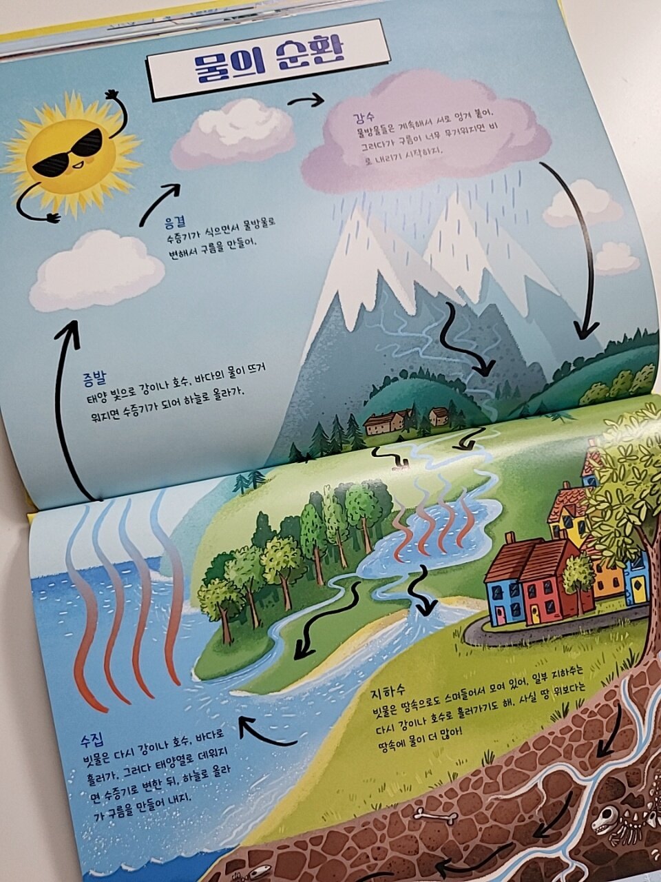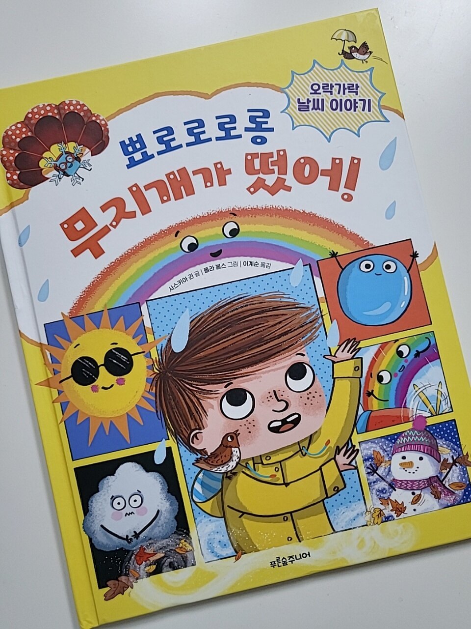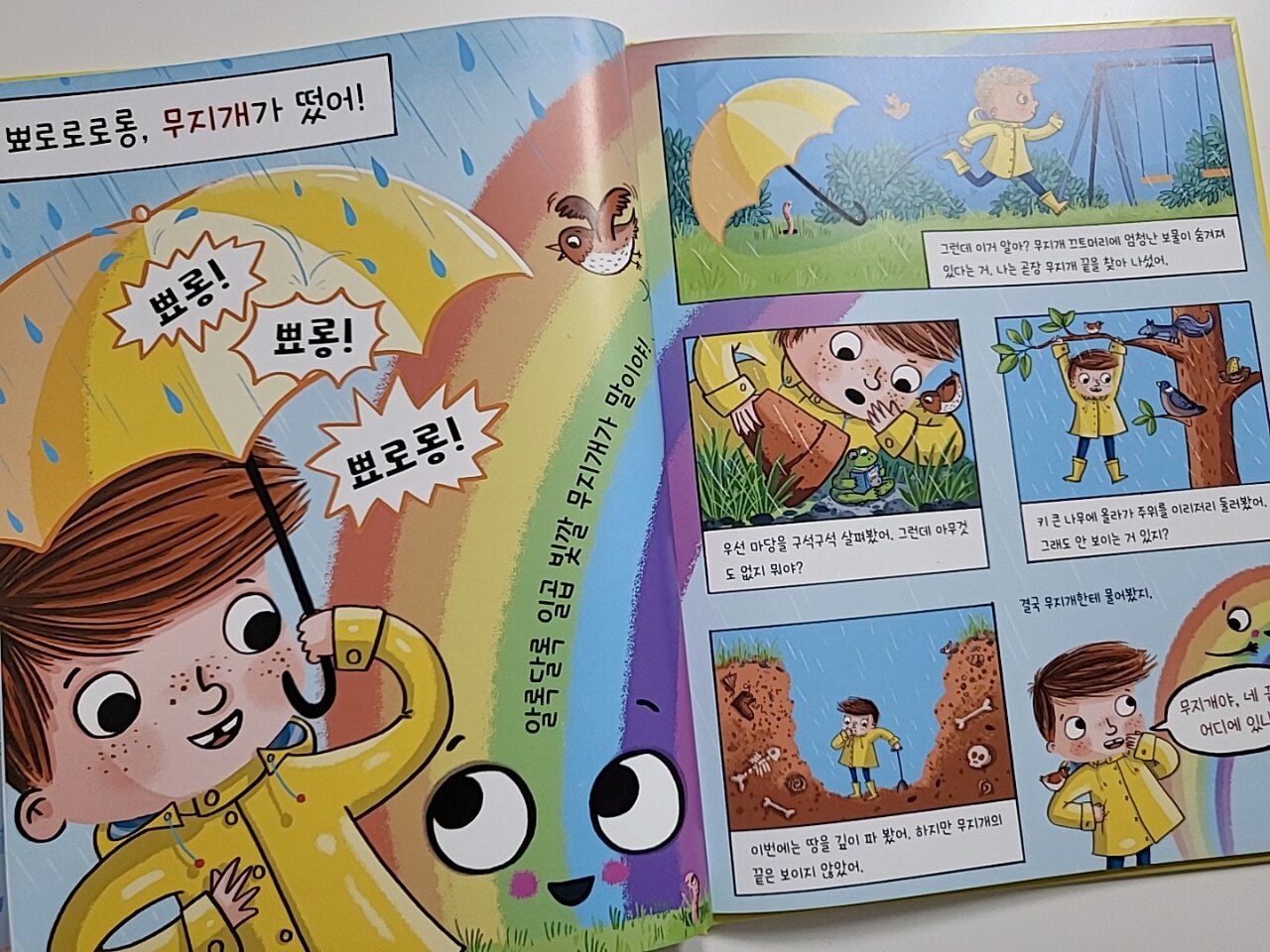 [출판사로부터 도서 협찬을 받았고 본인의 주관적인 견해에 의하여 작성함] 아이에게 무지개는 왜 뜨는지 번개는 왜 치는지 설명해주기 막막할 때가 한두번이 아닌데요. 아이 눈높이에 맞춰 날씨를 설명해주는 쉬운 과학 그림책이 있어 소개시켜드리려고 합니다. 바로 뾰로로롱 무지개가 떴어!에요. 아이들이 좋아하는 귀여운 그림체로 가득한 이 책은 딱딱한 과학책이 아닌 재미있는 그림책 같은 느낌을 주는 점이 마음에 들었어요. 아이도 표지를 보자마자 "이거 재미있을꺼 같아"라고 하더라고요. 무지개가 뜨고 아이가 무지개 끝을 찾아 떠나는 모험으로 이야기가 시작됩니다. 무지개의 끝은 어디지? 무지개 캐릭터에게 묻고 대답하며 그림을 보면서 무지개의 복잡한 과학 원리를 쉽게 이해했어요. 글보다 그림으로 보니 이해가 팍팍!! 결코 쉬운 내용이 아닌데도 아이가 원리를 이해하고 설명하더라구요. 이 책은 무지개가 떴다 구름이 몰려왔다 비가 왔다 안개가 생겼다~종잡을수 없이 변하는 날씨를 쉽고 재미나게 설명하고 있어요. 마지막 부분은 물의 순환을 보여주며 지금까지 본 비, 천둥, 눈 등이 어디에서 오는지 알려줍니다. 초등 과학에서 배우는 어려운 용어들도 자연스럽게 접할 수 있고 귀여운 그림체로 날씨에 대한 흥미와 과학적 사실을 쉽고 재미나게 풀어낸 점이 참 좋았어요. 아이 눈높이에 맞춘 쉬운 날씨책!! 뾰로로롱 무지개가 떴어!를 추천드립니다😊