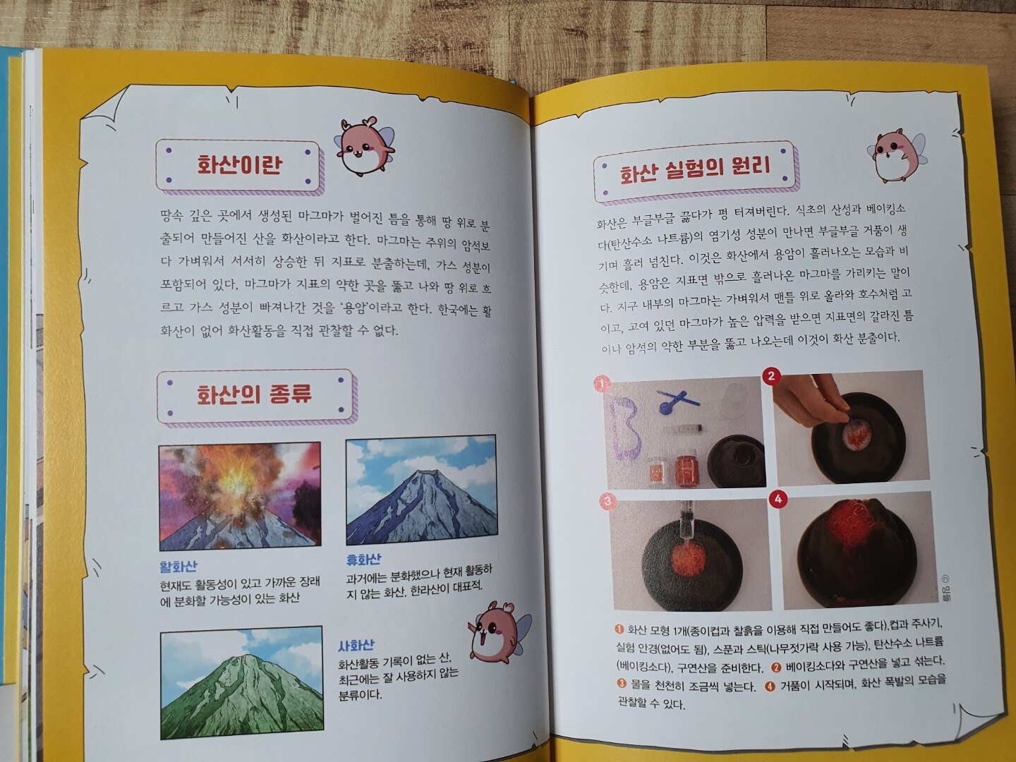 그림과 친구들의 대화만으로 설명이 되지 않는 부분은 이렇게 상세하게 수록해둔 부분이 있습니다. 얼마 전 초등학교 4학년 회장님이 학교에서 화산에 대해 배웠다며 2025년 백두산 화산 폭발을 얘기했는데요. 활화산, 휴화산, 사화산을 설명해줬는데 그 부분이 나오니 바하와 태양이가 격한 반응을 보입니다.^^ 역시 반복학습이 중요한 것이겠죠?^^