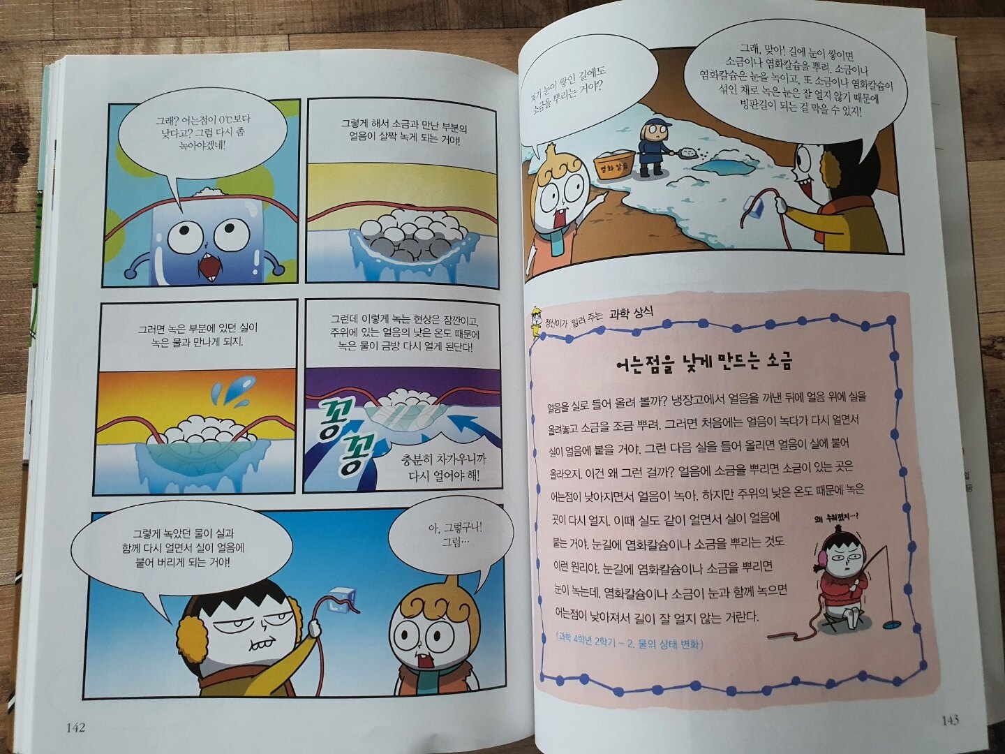 정신줄 가족이 언제까지나 곤충으로 있는 줄로 알았는데 다시 본 모습으로 돌아왔습니다. 그런데 이번엔 얼음과 소금에 대한 과학 원리를 재미있게 설명하네요. 소금은 어는 점을 낮게 만들어 주는데요. 얼음에 소금을 뿌리면 소금이 있는 곳은 어는점이 낮아지면서 얼음이 녹습니다. 하지만 주위의 낮은 온도 때문에 녹은 곳이 다시 얼게 되면서 얼음과 소금이 실과 얼음을 붙게 만드는 것입니다. 지금처럼 겨울철에 눈이 많이 내리거나 아주 추운 날씨에 염화칼슘이나 소금이 눈과 함께 녹으면 어는점이 낮아져서 길이 잘 얼지 않는 이유도 그때문인 것입니다. 아이들은 그래서 눈오는 날 하얀 알갱이를 뿌렸구나~ 하며 이해합니다.