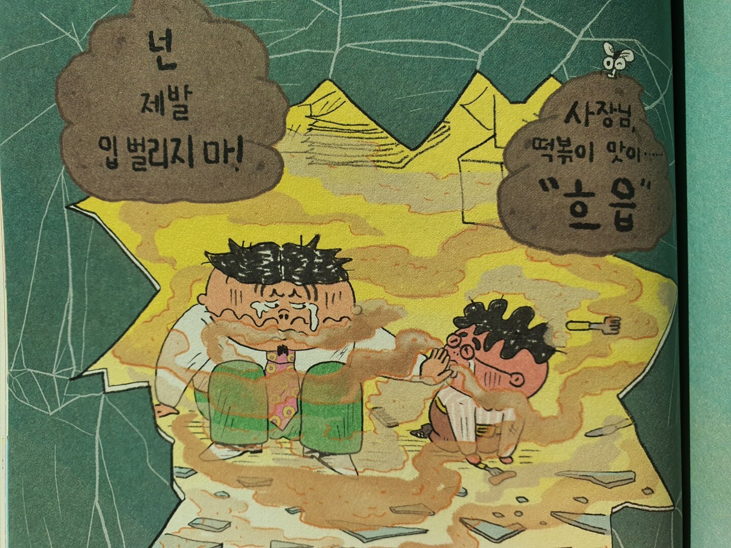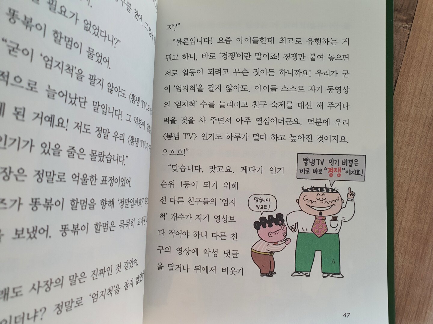 아무 잘못이 없을 것 같았던 뽐냄TV 사장은 결국 똥볶이 할멈의 주문으로 똥볶이 맛을 느끼게 되었습니다. 잘못이 있었다는 얘기겠죠? 뽐냄TV 사장은 '엄지척' 대신 다른 무언가를 팔았다고 합니다. 무엇을 팔았기에 아이들의 고민이 이렇게 늘어간 것이었을지... 책에서 확인해야 하는 거 아시죠?^^