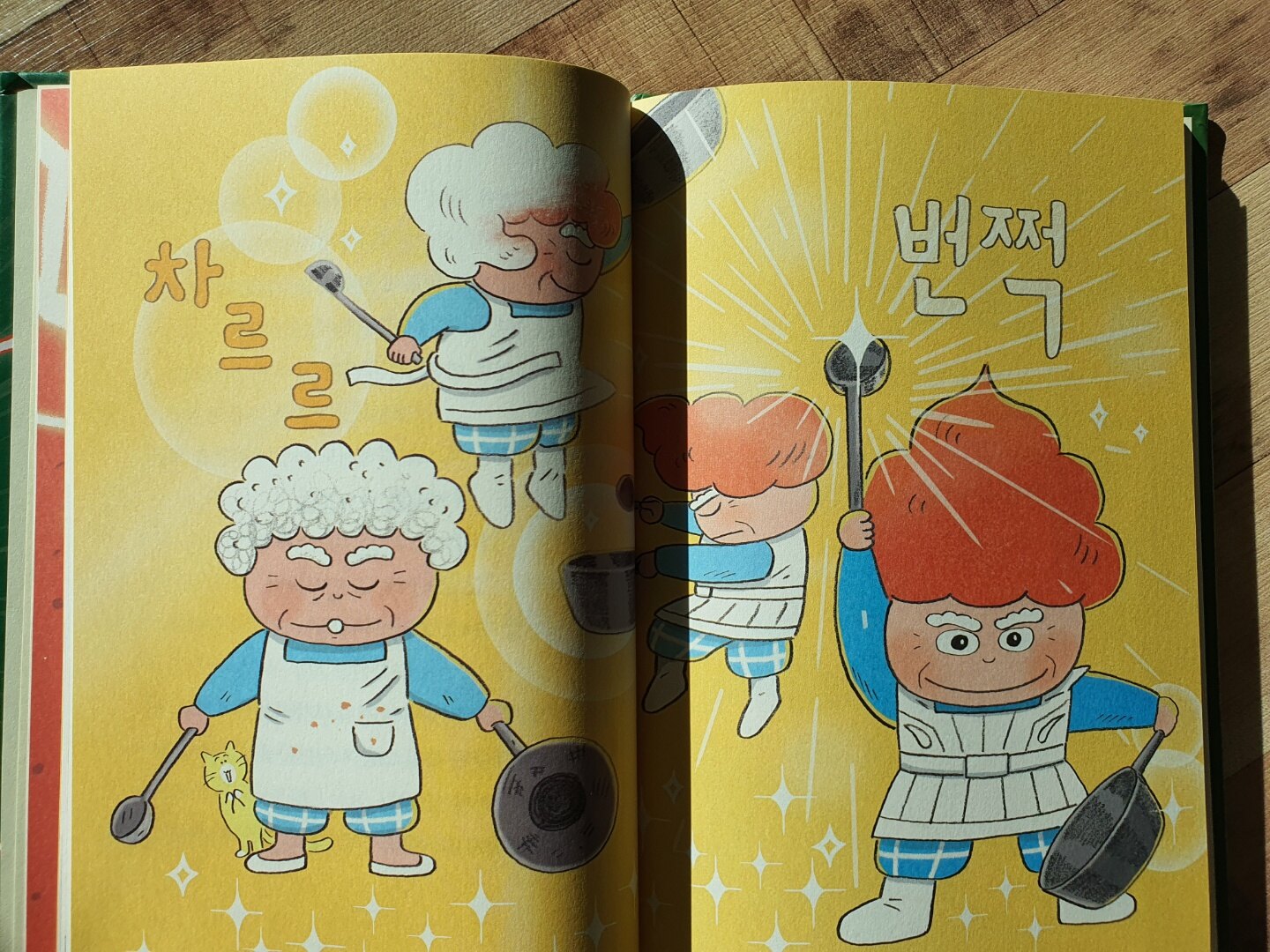 눈부신 빛이 번쩍하고 비치더니 할멈의 꼬부랑꼬부랑 짧은 머리가 풍성하고 탐스러운 붉은 머리로, 여기저기 톡톡 튄 떡볶이 국물 묻은 앞치마는 새하얗고 차르랑거리는 멋진 갑옷으로, 오래되고 손때 묻은 국자와 냄비는 번쩍번쩍 광이 나는 어마어마한 무기로 변신!!