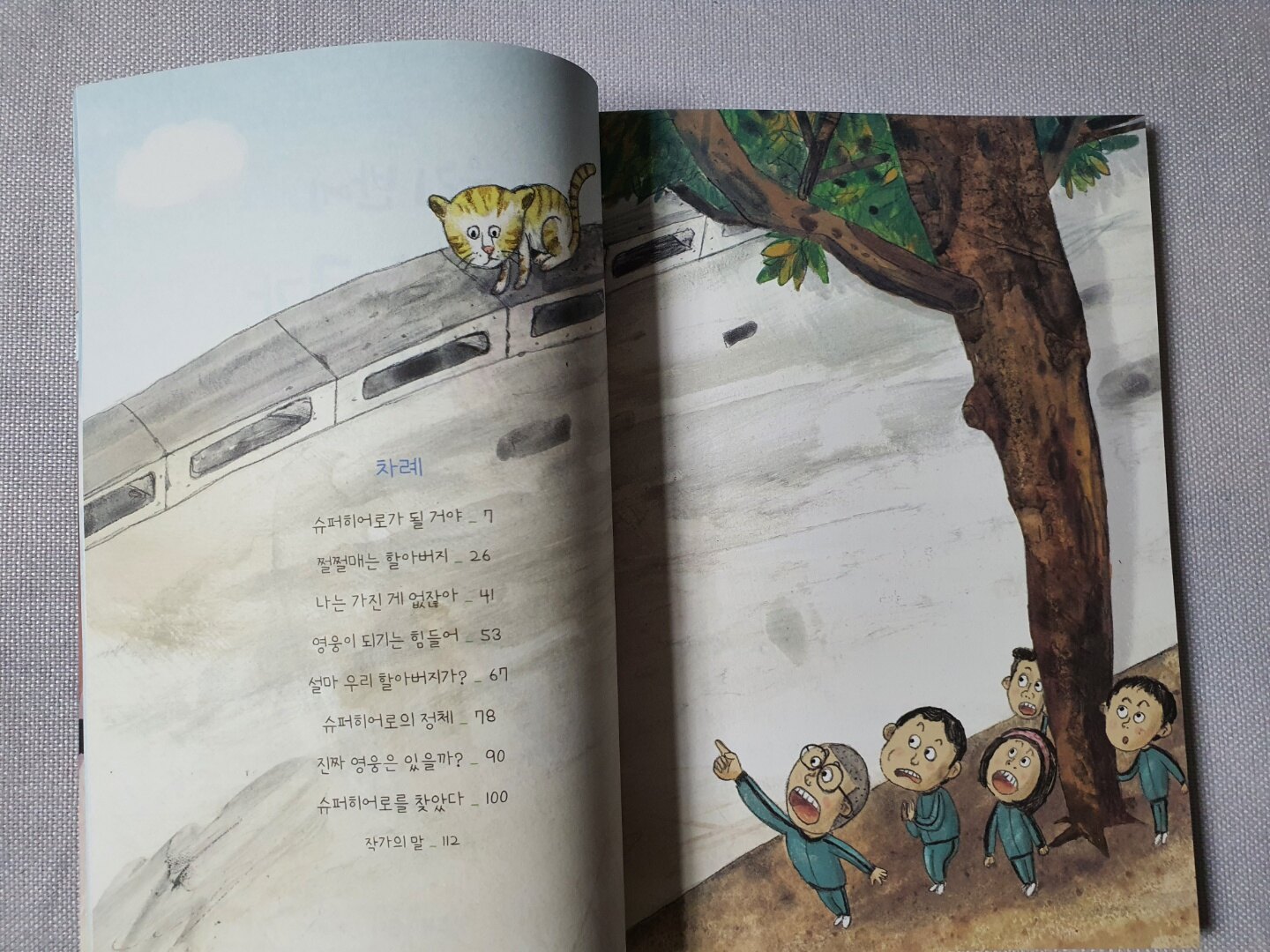 슈퍼히어로가 되고 싶었던 선우는 학교에서 고양이를 구하다 다리를 다쳐 2주 동안 깁스를 하게 되었습니다. 그 바람에 할아버지는 선우의 등하교를 해주게 되었고, 그 길에서 한 사고를 목격하게 됩니다. 바로 선우가 다니는 학교 병설유치원 버스가 빗길에 미끄러지며 저수지로 굴러떨어졌던 것인데요. 생각할 겨를도 없이 할아버지는 선우에게 119에 신고하라며 휴대전화를 주고 차로 달려갔고 결국 할아버지 덕분에 무사히 모두 구조될 수 있었습니다. 선우는 생각합니다. 슈퍼히어로는 할아버지였다는 것을요.