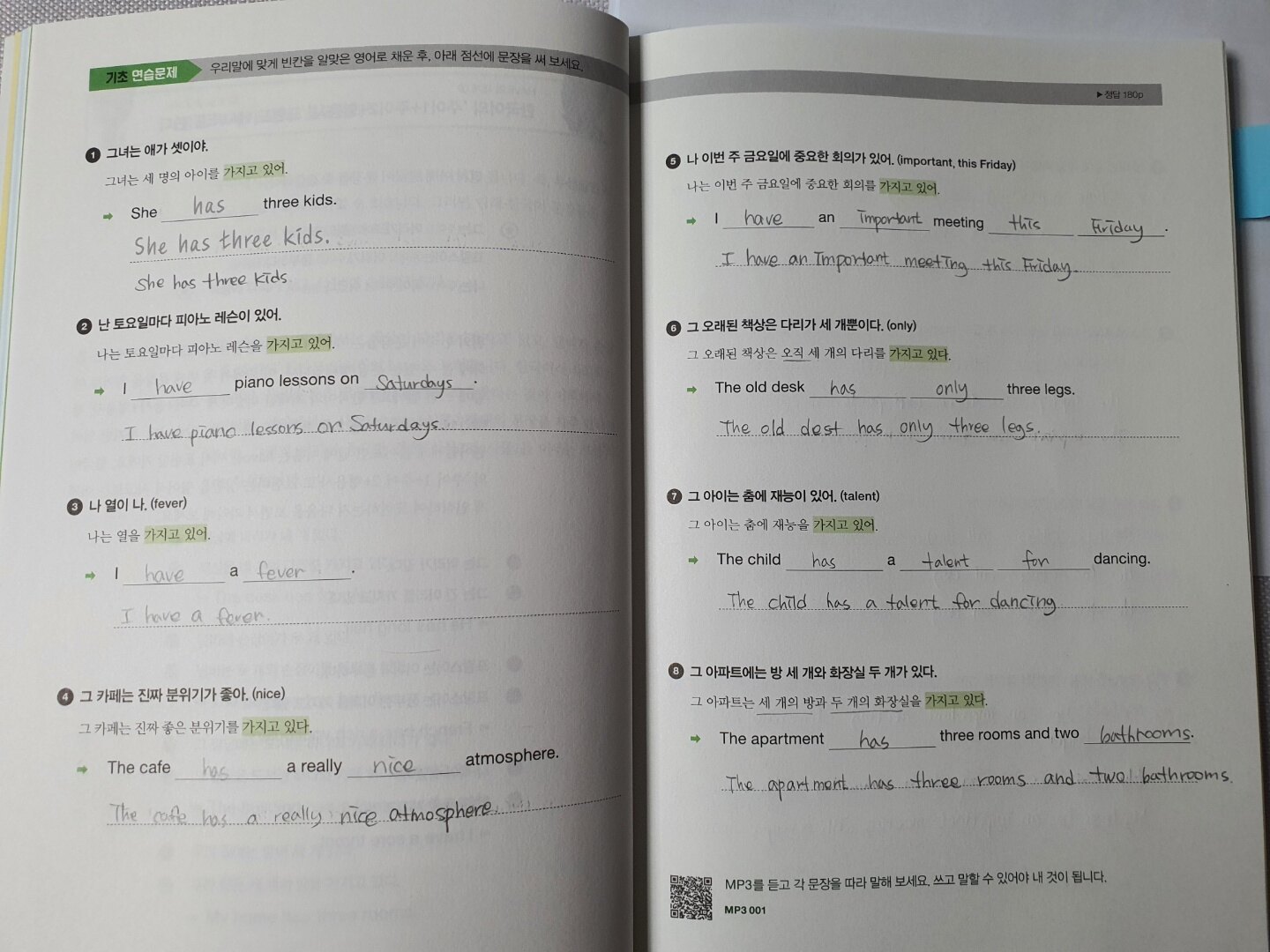 각 단원이 끝나면 공부한 내용을 토대로 영어 문장을 직접 만들어볼 수 있는데요. 몇 단원 해보니 요령이 생겼습니다. 일단 첫 문장만 만들어 놓고 큐알코드 찍어서 MP3를 들으며 두번째 문장을 채우는 방법입니다.