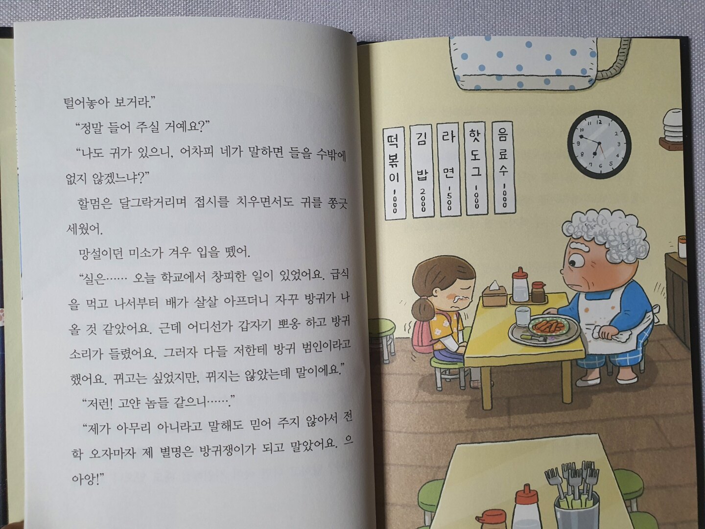 미소에게 근심이 있음을 느낀 똥볶이 할멈은 '밑져야 본전'이라며 무슨 일인지 속 시원하게 얘기해 보라고 합니다. 그 얘기를 들은 미소는 망설이다 입을 뗐고 똥볶이 할멈은 잠자코 들어주었습니다. 미소는 급식 후 배가 아프고 자꾸 방귀가 나올 것 같았으나 참았다고 합니다. 하지만 그때 어디선가 갑자기 뽀옹 하고 방귀 소리가 들렸고 친구들은 미소가 방귀 범인이라며 놀려댔다고 합니다. 전학 오자마자 별명이 방귀쟁이가 되어버린 미소는 한없이 속상했던 것입니다.