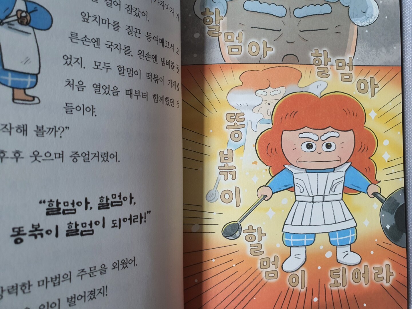 강력한 마법의 주문을 외우자 할멈의 꼬부랑꼬부랑한 머리가 풍성하고 탐스러운 붉은 머리로, 여기저기 톡톡 튄 떡볶이 국물이 묻은 앞치마는 새하얗고 차르랑 거리는 멋진 갑옷으로, 오래되고 손때 묻은 국자와 냄비는 번쩍번쩍 광이 나는 어마어마한 무기로 변했습니다. 그렇게 똥볶이 할멈은 조수 고양이와 함께 범인을 찾기 위해 나서게 됩니다.