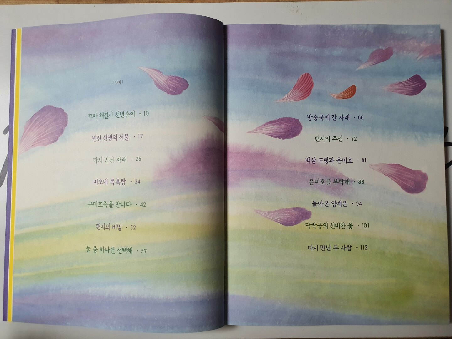 천년손이와 자래 중 하나는 인피면구를 써서 임예은이 되고 나머지 하나는 사라진 구미호 임예은을 찾기 위해 나섭니다. 닥락궁 신선이 몰래사라질꽃을 들고 주문을 외우면 비밀 장소로 이동하게 된다고 합니다. 그리고 다시 돌아오기 위해선 꽃이 있어야 한다고 하는데 꽃을 놓고 사라진 백삼도령과 은미호 임예은. 신선과 구미호가 사라진 이유는 도대체 무엇이었을까요?