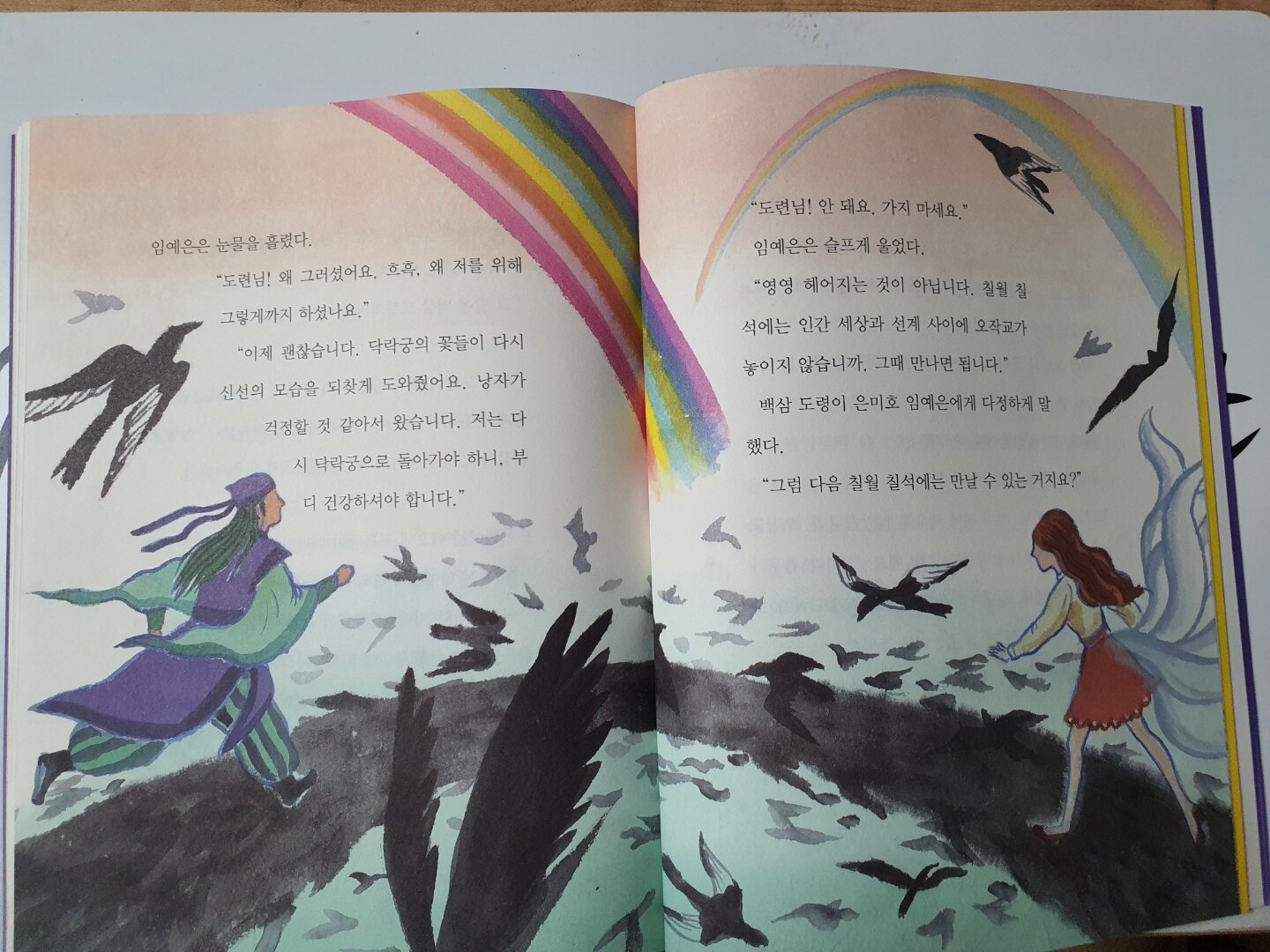 이 장면이 스포인 줄 알고 있음에도 너무 아름다운 장면이라 담아 봅니다. 구미호 임예은을 돕기 위해 백삼 도령은 자신을 희생하여 구미호 꼬리의 형태를 원래대로 만들어 주며 회복시켜주었습니다. 그렇기에 다시는 만날 수 없을 것만 같았던 백삼 도령이 어떻게 다시 오작교에서 구미호 임예은을 만날 수 있게 된 것일지에 대한 내용은 책에서 확인하시길 바랍니다.^^