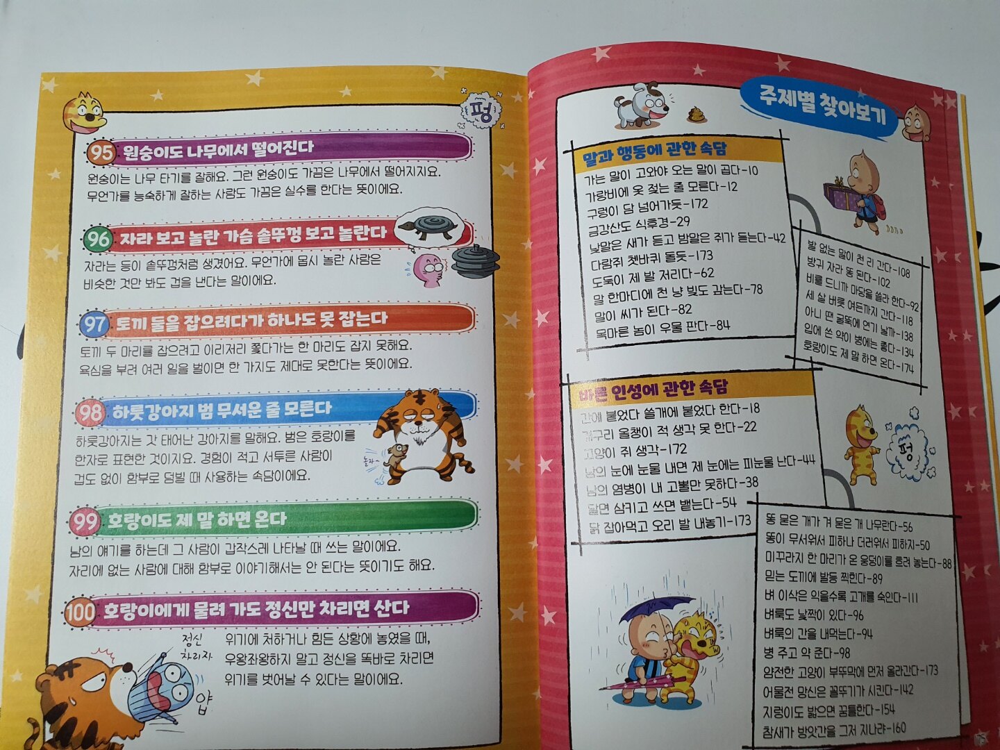 동물의 행동이나 특징에 빗대어 어떤 사람의 성격이나 태도를 표현할 수 있는데 이러한 속담을 따로 분류하여 '동물이 나오는 속담'이 16개가 수록되어 있습니다. 이 부분이 만화로 나오지 않아 바하가 많이 아쉬워했던 부분이긴 한데요. 속담에 어떤 동물이 등장하는 내용을 따로 볼 수 있어 좋기도 하였습니다. 또한 '주제별 속담 찾아보기' 부분에서는 말과 행동에 관한 속담, 바른 인성에 관한 속담, 사람과의 관계에 관한 속담, 예상하지 못한 상황에 쓰는 속담, 돈과 욕심에 관한 속담, 지혜와 어리석음에 관한 속담, 희망과 용기를 주는 속담으로 분류되어 내가 쓰고자 하는 속담을 찾아 상황에 맞게 사용하기에 편리할 것 같습니다.