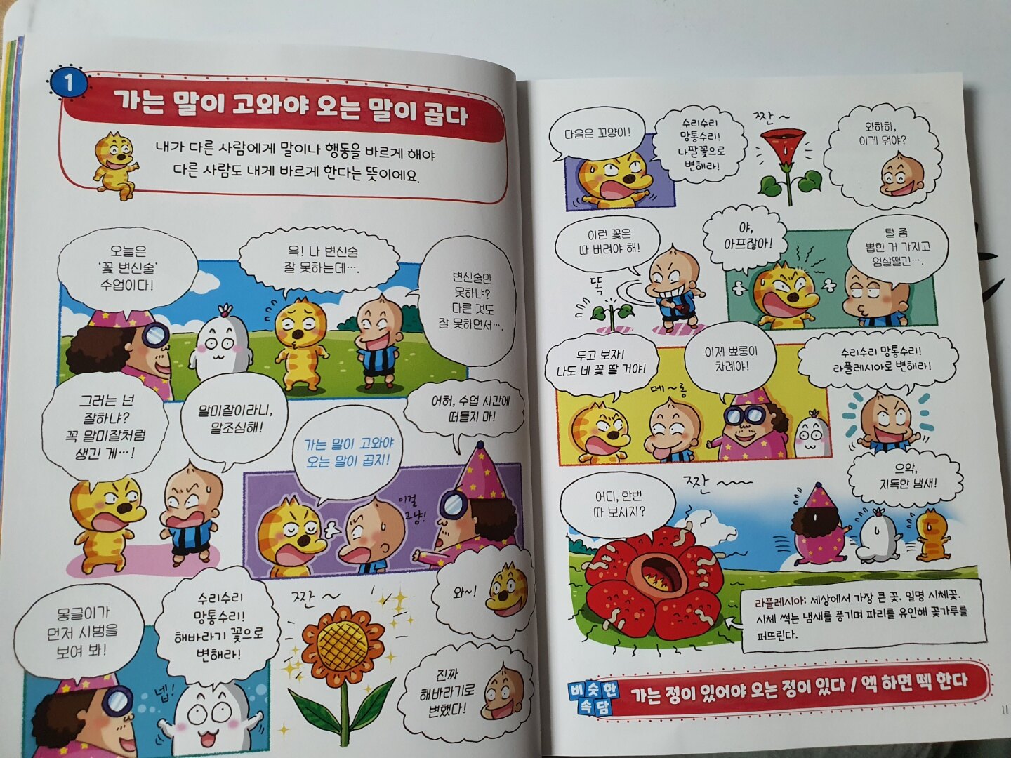 간략하게 속담의 뜻이 설명되어 있고 그에 해당하는 속담이 쓰이는 상황에 대해 만화로 되어 있습니다. 끝부분에는 비슷한 속담까지 수록되어 있어서 실제로 이 책 한권에는 100개의 속담이 아닌 더 많은 속담이 있습니다. 책을 다 읽은 초등학교 2학년 바하에게 뜻을 설명해주고 속담을 맞추게 해보았는데요. 한 번 읽었을 때는 속담을 기억하기보단 만화 내용이야기를 기억했습니다. 하지만 두 번째 완독 했을때는 속담도 기억해주네요.^^ 눈치채셨나요? 이 책도 역시 만화라고 바하가 엄청 재밌게 읽습니다. 만화를 좋아하는 바하긴 해도 재미없으면 다시 읽지 않는 바하인데 바하가 두 번 이상 읽는 책은 정말 재미있다는 결론이 나옵니다.^^