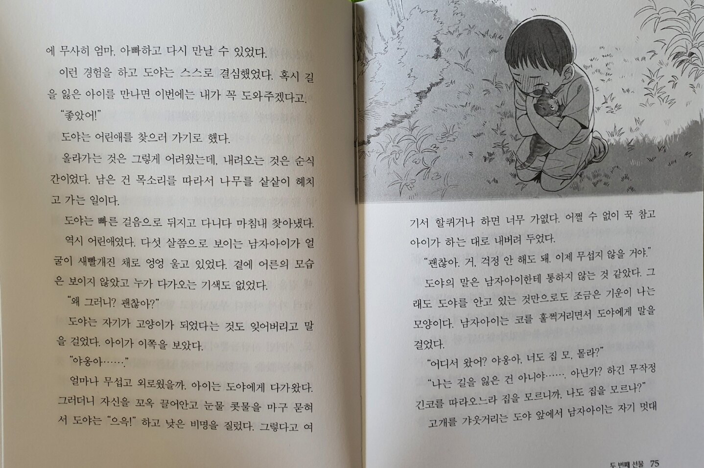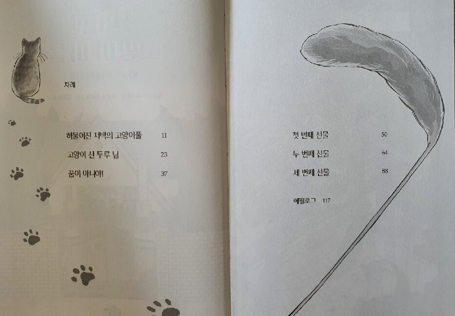 마지막 선물은 무엇이었을까요? 도야는 두루님에게 세 가지 선물을 모두 드리고 다시 사람으로 돌아올 수 있었을까요? 당연히 도야는 도야로 다시 돌아올 수 있었습니다. 그리고 도야에게 나타난 고양이 '카카'. 그런데 사람으로 돌아온 도야는 고양이 카카와 말이 통하네요.^^ 말이 통한 도야에게 카카는 고양이의 상담사 노릇을 맡아 달라고 합니다. 도야가 두루님의 마음에 들었다나 뭐라나~ 도야의 대답은 뭔지 감이 오시죠?