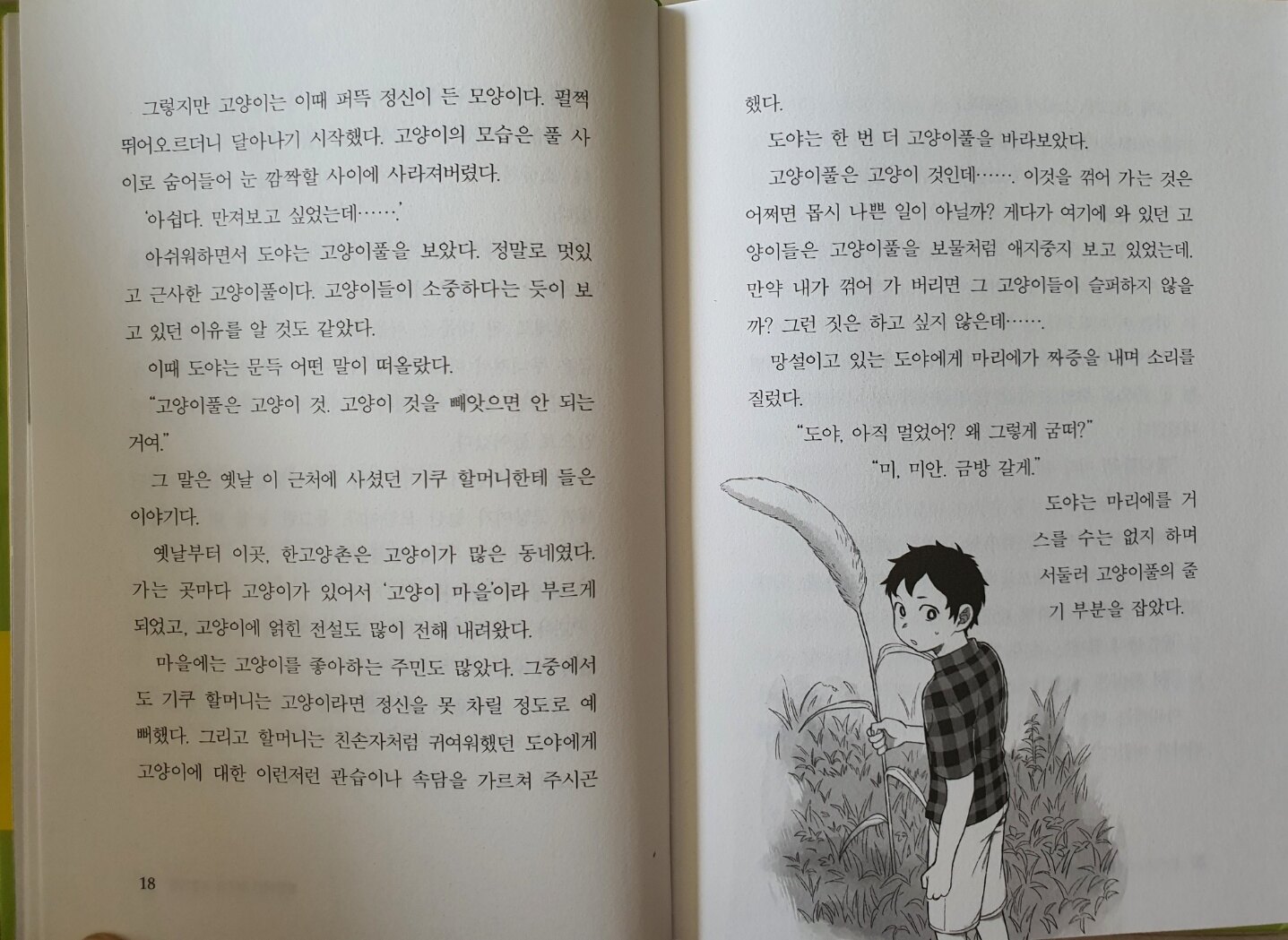 일단 시작은 작가의 명성이었으나 묘하게 빠져드는 매력이 있어 읽게 되는 『신비한 고양이 마을』이었습니다. 제목이 '고양이풀의 저주'이지만 '저주'라는 단어 대신 '행복'이나 '행운'을 써도 문맥이 통할 것 같네요. 어쩌면 쉽고 편하게 가려는 현대인들의 마음을 조금은 내가 노력해서 얻는 즐거움과 뿌듯함을 일깨워주는 것도 같았습니다. 내 노력으로 얻은 것을 선물로 준다면 그 마음까지 전해져 받는 이가 더 기쁘겠죠? 이 마음을 우리 아이들이 꼭 알아갔으면 좋겠습니다. 『신비한 고양이 마을』은 글밥이 조금 있긴 하지만 그리 길지 않아서 초등학교 저학년도 잘 읽을 것 같네요^^