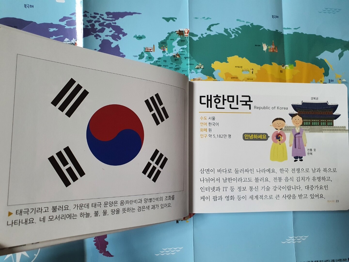 가장 먼저 한국은 '태극기'라는 국기를 사용합니다. 아무래도 한국사람이다보니 태극기가 가장 멋지고 가장 아름답고 가장 위대해 보이는데요. 태극기는 흰색 바탕에 가운데 태극 문양과 네 모서리의 건곤감리 4괘로 구성되어 있습니다. 대한민국은 수도를 서울로 두고 한국어를 사용하며 인구는 약 5,182만명입니다. 『나의 첫 세계 국기 사전』 를 살펴보면 대한민국과 바레인, 부탄 등이 전통 옷인 한복을 남,여가 입고있는 모습이 그려졌는데요. 역시 제 눈에는 한복이 가장 아름다워 보입니다.^^