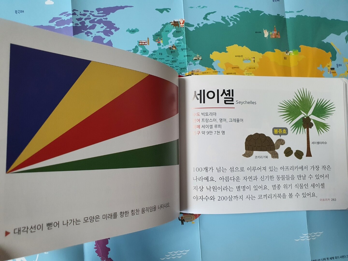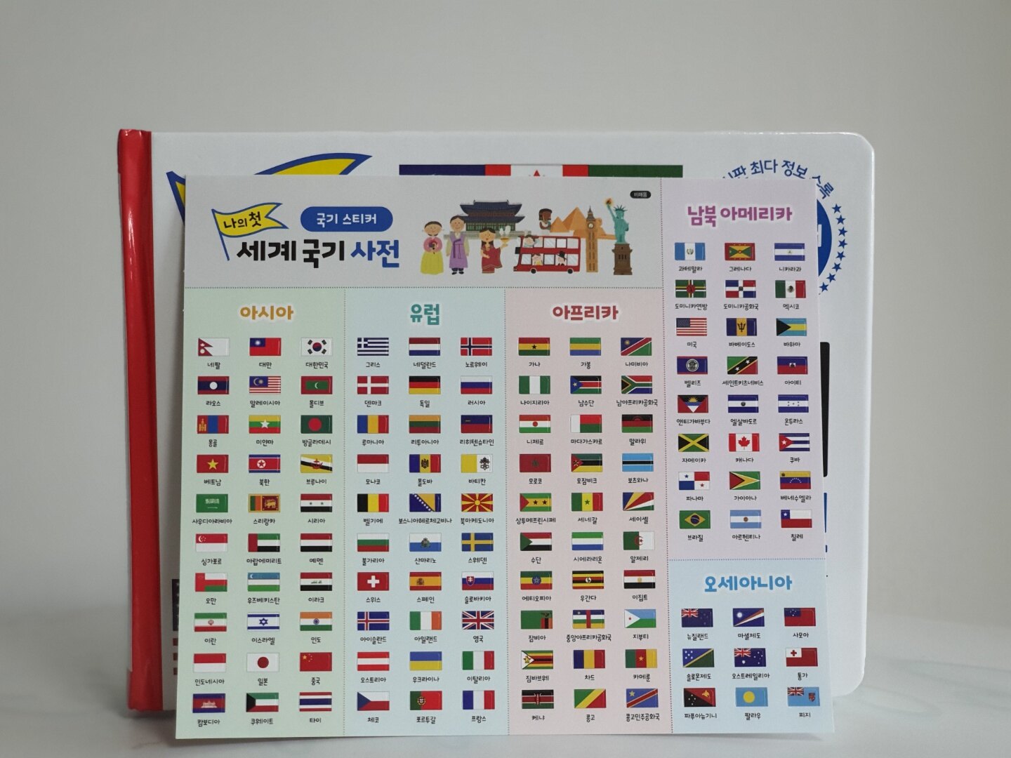 회장님맘의 집에는 한쪽 벽에 커다랗게 세계지도를 붙여두었는데요. 콕 집은 나라가 궁금할땐 이렇게 색인이 되어 있어 그 나라를 자세히 들여다볼 수 있습니다. 세계지도에 조그맣게 국기가 붙어있는데 이렇게 『나의 첫 세계 국기 사전』 으로 큰 그림으로 보니 더욱 자세히 볼 수 있어 좋네요.