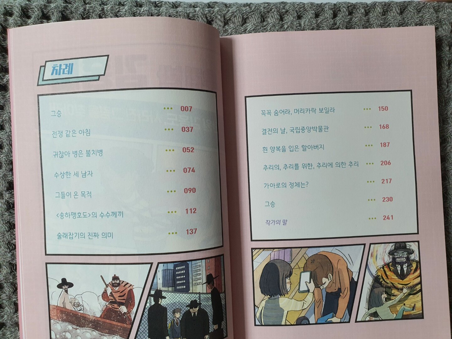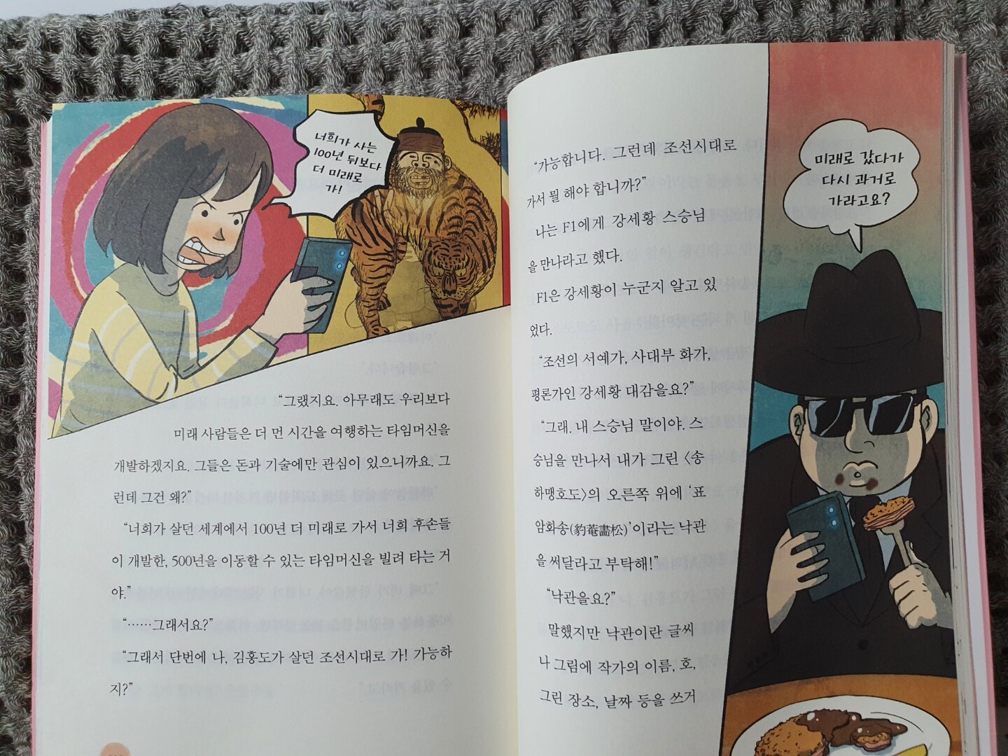 홍래는 미래에서 온 검은양복의 남자 중 F2에게 다시 그들이 살던 100년 뒤 미래로 가서 그 뒤의 100년 뒤 미래로 갔다가 그들의 후손들이 개발한 타임머신을 타고 500년 전인 김홍도가 살던 조선시대로 가라고 합니다. 홍래가 살고 있는 현재에서 100년 뒤 미래에선 미래와 과거 100년씩만 이동할 수 있는 타임머신이 개발된 터라 그 이상을 가지 못하기 때문에 이런 생각을 하게 된 것인데요. 조선시대로 돌아가 F2에게 지시한 내용은 스승의 낙관을 새겨 오라는 것이었습니다. 과연 이 낙관이 그림이 사라지는 것을 막을 수 있는 열쇠가 될 수 있었을까요? 아참! 그리고 술래잡기가 끝나고 이제는 저승에 가겠다고 하는 김홍도에게 이전 위인들처럼 해야 할 일을 마쳐야 한다고 하는 가아로의 마지막 꿍꿍이는 무엇이었을까요?^^ 아시죠? 책에서 확인하셔야 된다는 거...^^