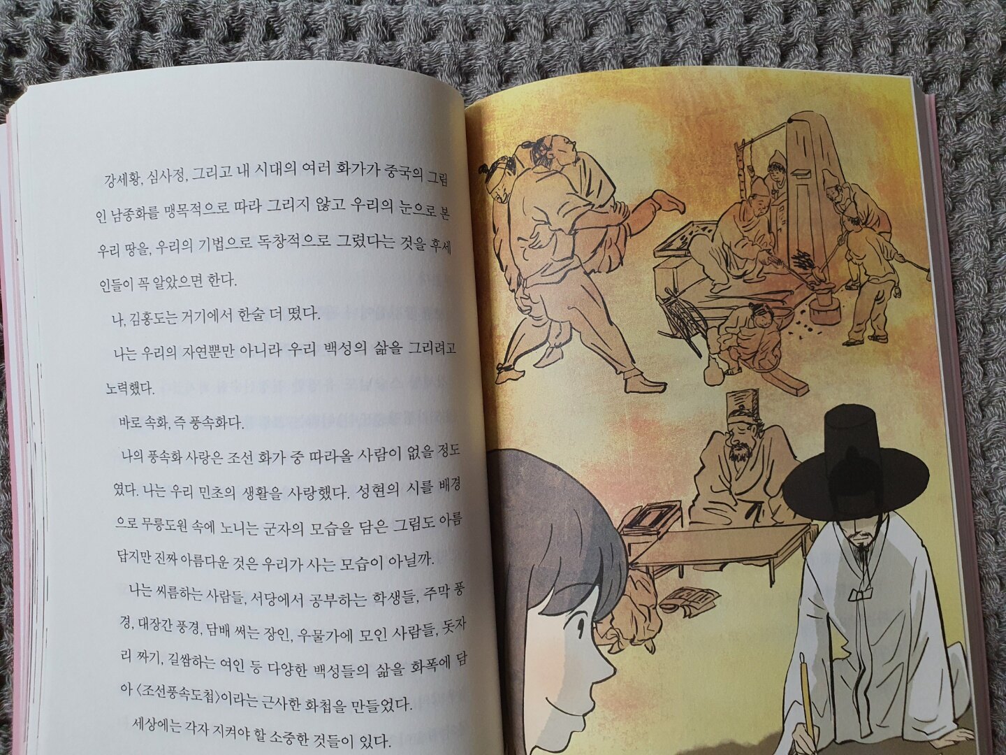 책의 곳곳에 김홍도에 대한 이야기가 많이 등장합니다. 스승에 대한 이야기, 친구에 대한 이야기부터 김홍도가 즐겨 그린 그림 이야기까지 김홍도에 대해 알아가기 충분한 내용이 담겨 있었습니다. 이렇듯 홍래가 된 김홍도는 자신이 그린 그림이 잘 보존되어 있음에 뿌듯해하며 자신이 지난날들을 회상합니다.