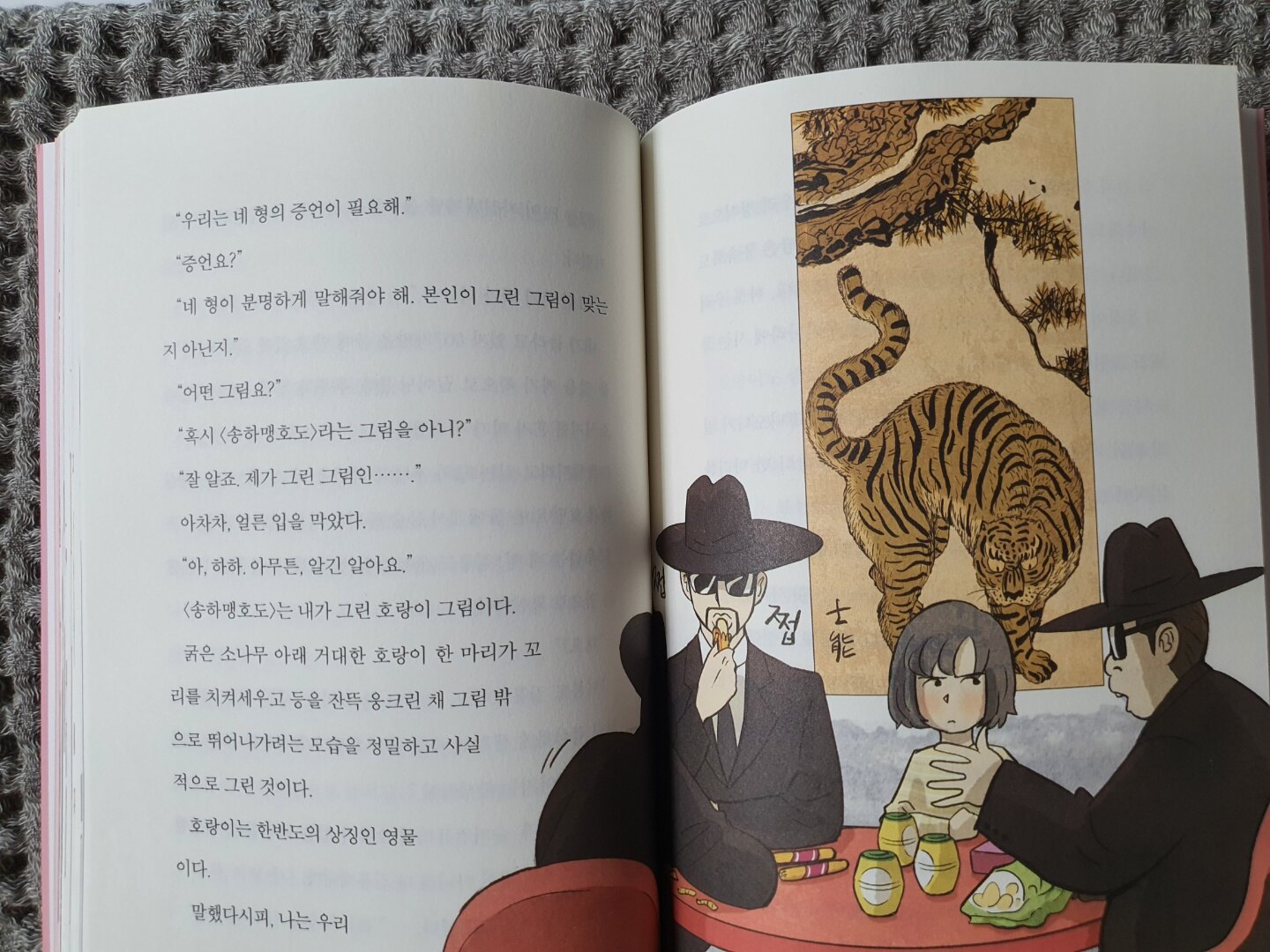 '송하맹호도'는 김홍도의 그림으로 널리 알려져 있습니다. 특히 이 그림은 하단 부분의 김홍도의 낙관과 상단부분의 표암 강세황의 낙관이 있어 이목이 집중된 그림인데요. 그 당시에는 필체로 그림을 그린 사람의 진위를 구분한다고 합니다. 이에 소나무는 친구 이인문이 그림은 김홍도가 그린 것으로 알고 있지만 표암 강세황의 낙관에 대해서 의견이 분분한 것입니다. 그림만 보자면 소나무는 강세황이 호랑이는 김홍도가 그린 것이나 많은 전문가들은 소나무를 이인문이 그린 것으로 추측하기 때문입니다. 『우리 반 김홍도』를 쓴 차유진 작가는 바로 이 점에서 역사적인 사실에 비어 있는 공간을 상상력으로 채워 넣어 이야기를 만드는 팩션을 쓴 것입니다. 단순히 김홍도를 알아가는 데 그치지 않고 김홍도가 살아 돌아온 것처럼 그의 생각을 눈앞에서 읽어내려가는 듯한 느낌을 받은 것도 팩션 덕분인듯합니다.