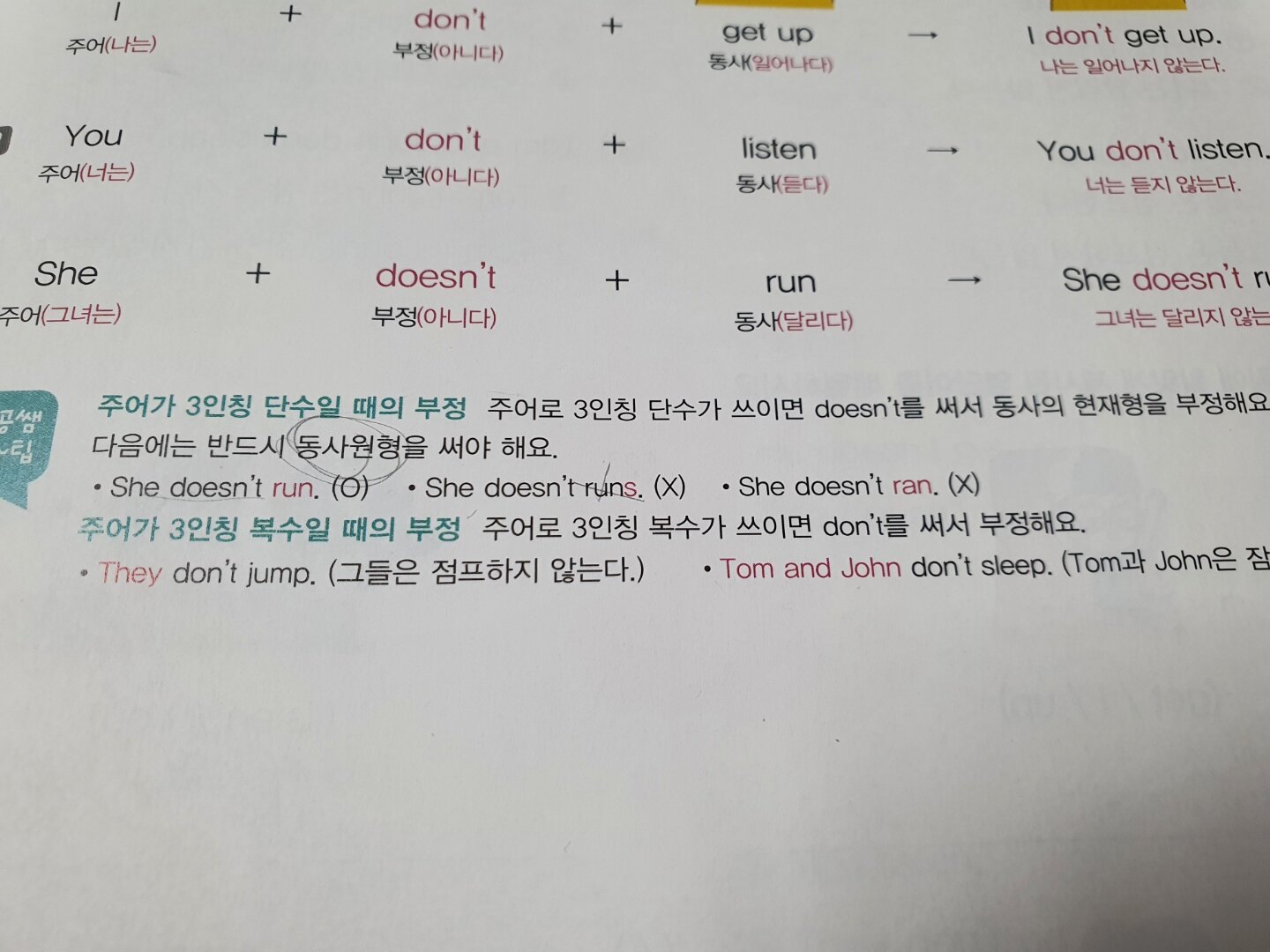 주어로 3인칭 단수가 쓰이면 doesn't를 써서 동사의 현재형을 부정해요.