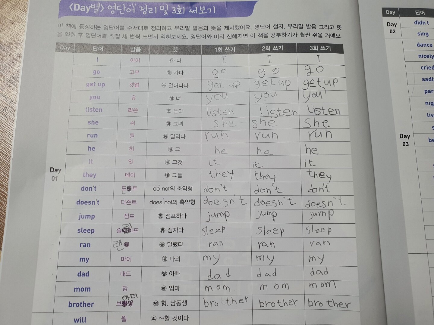 Day 01 _ 가볍게 20분도 안되어 끝내고 학원에서 배웠던 내용과 비교해보며 하루 공부를 마치는 초등학교 4학년 회장님. 이에 질세라 초등학교 2학년 바하도 옆에서 언니 하는 모습에 하고 싶어하길래 영단어장을 건넸습니다.