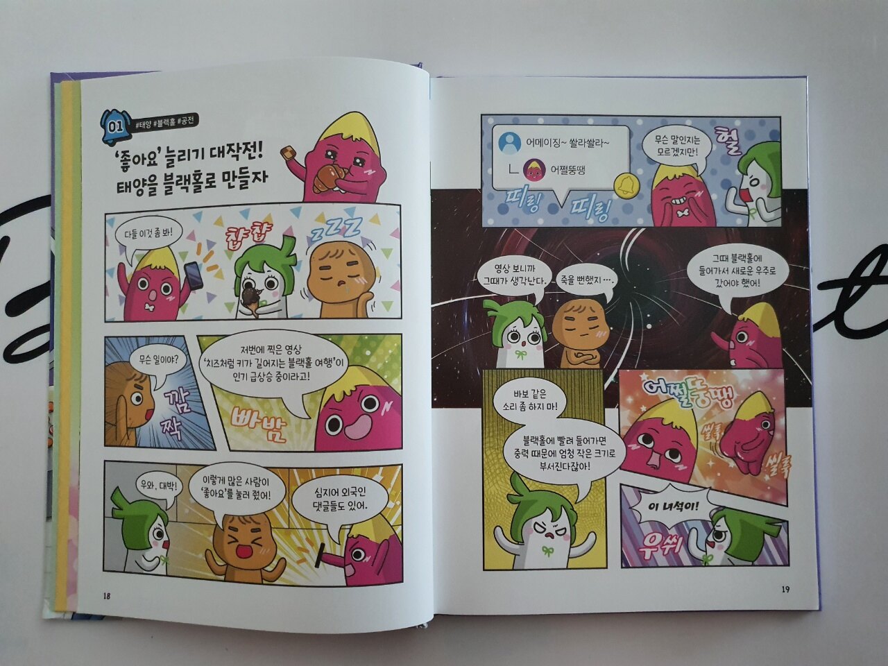 요즘 장래희망으로 '유튜버'가 인기 급상승이라고 하던데... 어쩔뚱땡 고구마머리도 인기 유튜버가 되고 싶은 것일까요? '좋아요' 늘리기 대작전을 펼치기 위해 우주 탐험을 시작하는 고구마머리 탐험대는 오늘도 즐겁습니다. 조회 수를 위해 태양을 블랙홀로 만들자는 의견을 제시하는 고구마머리는 오늘도 엉뚱하고요^^