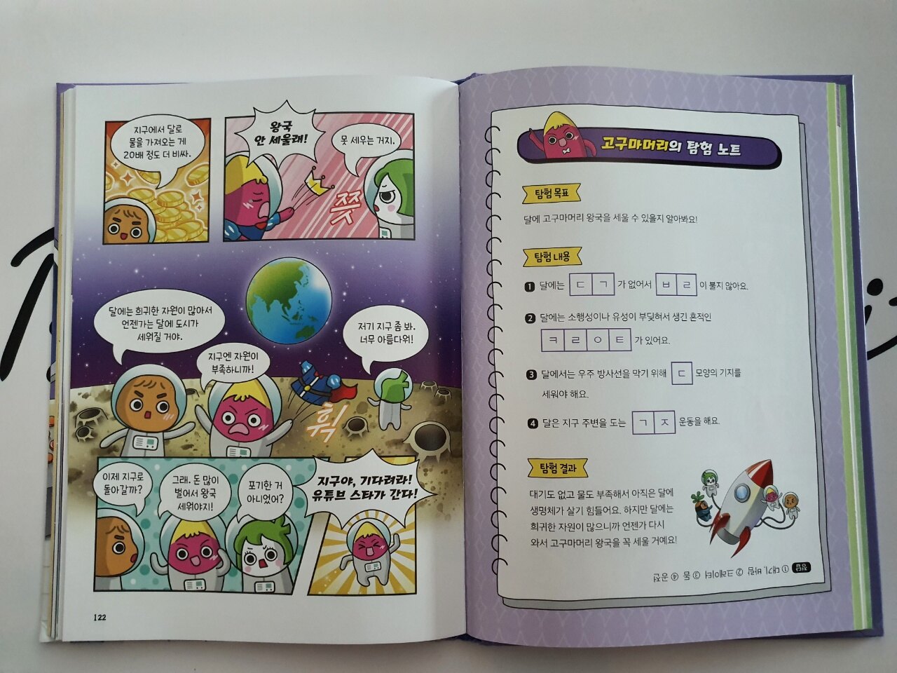 학습만화의 '학습'이라는 문구에 적합한 탐험 노트입니다. 고구마머리 탐험대와 함께 재밌게 읽으면서 익혔던 우주에 대한 이야기를 초성퀴즈와 함께 풀어보면 복습의 효과가 있겠죠? 각 장이 끝날 때마다 가로세로 낱말퀴즈, 에필로그 등으로 본문 내용을 복습하는 구성이 정말 좋네요.