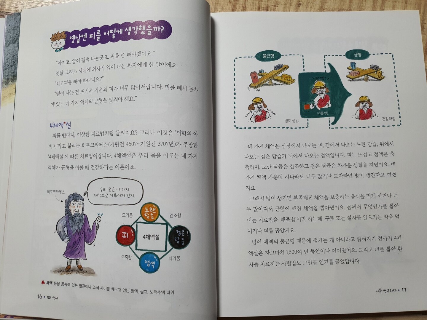 첫 이야기부터 '체액(동물 몸속에 있는 혈관이나 조직 사이를 채우고 있는 혈액, 림프, 뇌척수액 따위)'에 대해 나오네요. 피를 뺀다고 하니 흡혈귀가 인간을 공격하는 이야기부터 생각나지만 병이 생겨 네 가지 체액 가운데 너무 많아져 균형이 깨진 체액을 뽑아내는 것입니다. 병이 체액의 불균형 때문에 생기는 게 아니라고 밝혀지기 전까지 4체액설은 자그마치 1,500여년 동안 이어졌다고 하니 놀라움을 금치 못했답니다.