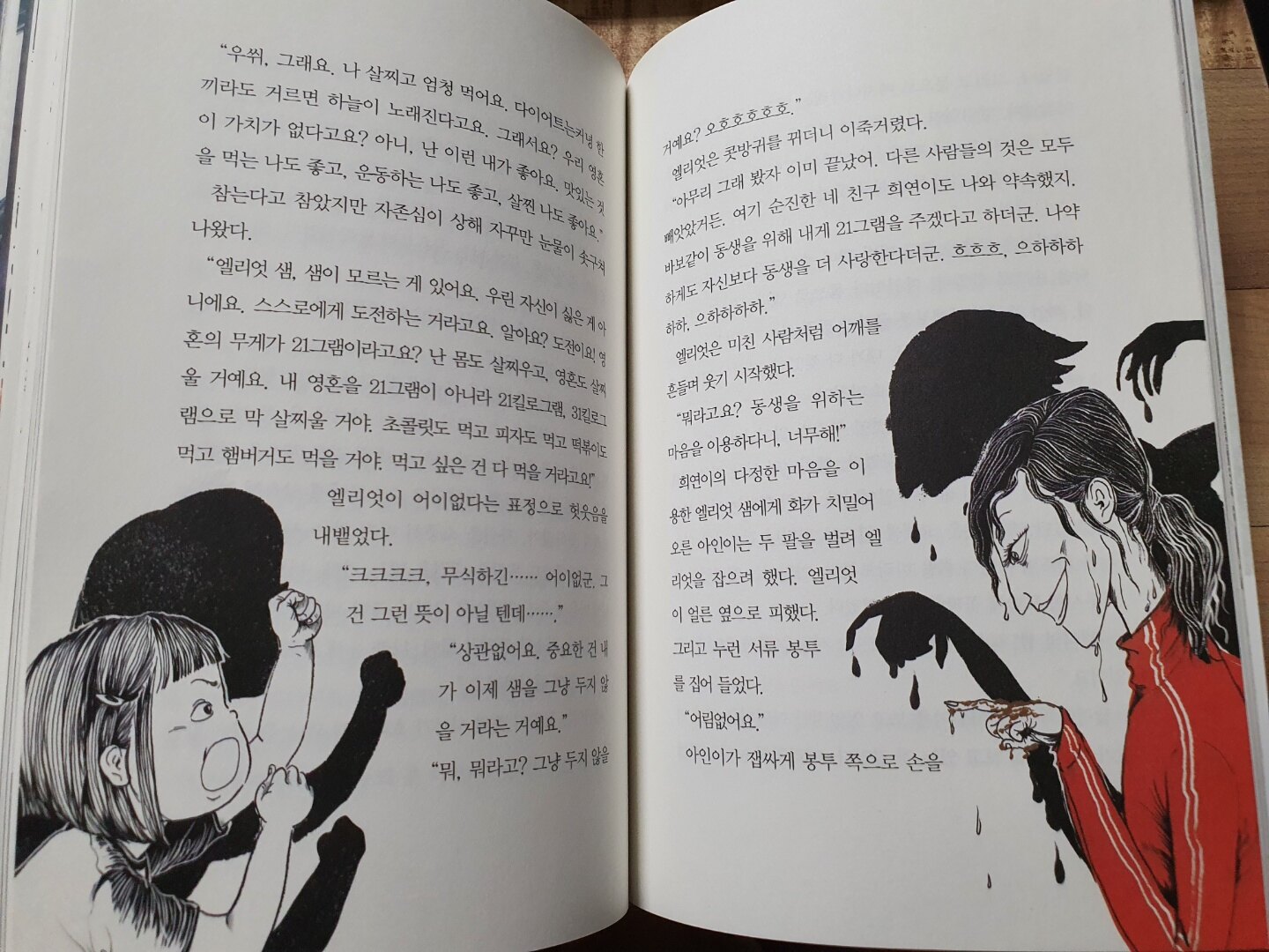 모든 그림들이 대놓고 무서워하라는 듯 어둡고 오싹한 느낌이 한가득입니다. 등장인물로는 아인이와 아인이 친구들인 정아, 희연이가 있고요. 다이어트 캠프의 선생님 엘리엇, 다이어트 캠프 참가자 헤이맨 등이 있습니다. 그리고 차례에서 보다시피 검은 집의 세 아이까지 있네요. 검은집의 세 아이 정체가 궁금하시면 끝까지 읽어주세요^^