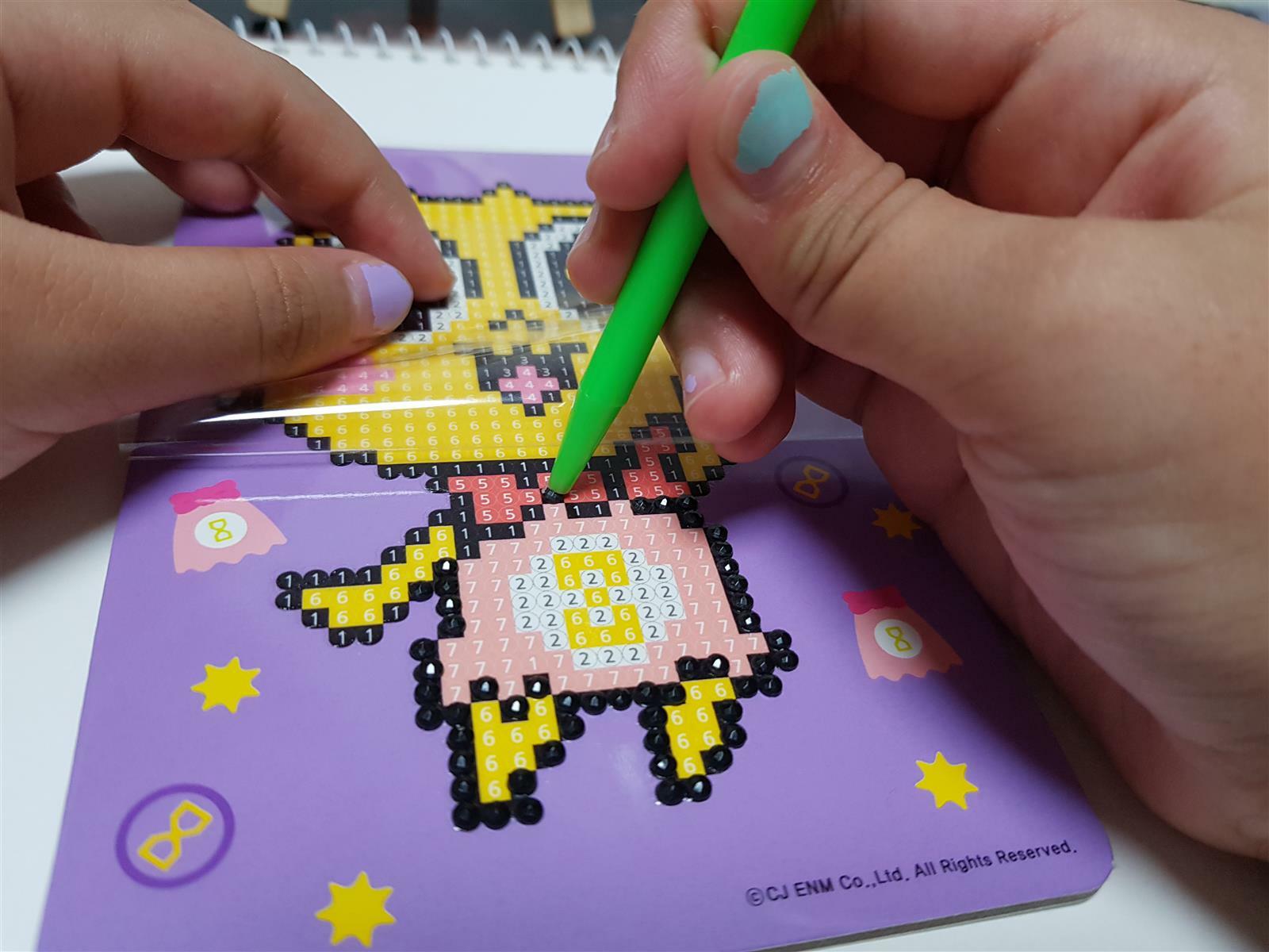 3. 도안의 투평 보호필름을 조금씩 벗겨내가며 도안의 번호와 일치하는 보석을 붙여주세요.