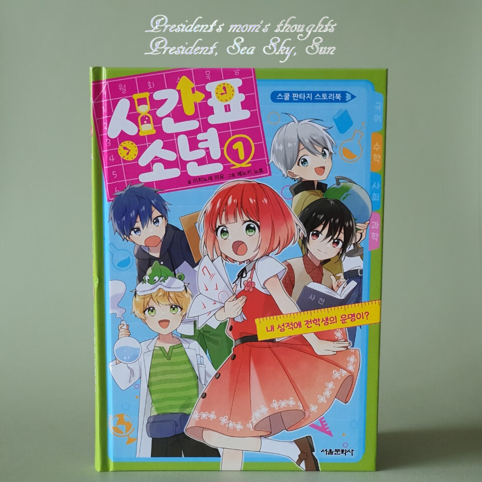 누군가 내 시험 성적을 한심(?)해 하며 전적으로 내 성적만을 위해 나와 함께해 준다면 어떨까요? '서울문화사' 출판사의 스쿨 판타지 스토리북 『시간표 소년』 첫 번째 이야기는 공부 포기를 선언하고 교과서를 버린 초등학교 5학년 공하나의 이야기입니다. 엄마가 기뻐하는 모습을 보며 공부를 했던 하나는 엄마가 돌아가신 후 공부의 의미를 잊게 되는데요. 하나가 버린 교과서들이 4명의 꽃미남이 되어 나타났다고 합니다. 버렸던 교과서가 4명의 소년이 되다니... (그럴 줄 알았으면 모든 교과서를 버렸....ㅋㅋㅋ) 단순히 거기서 끝나는 것이 아니라 이 4명의 소년의 수명은 하나의 시험 점수로 결정이 된다는 놀라운 사실!! 과연 꽃미남 교과서들의 수명을 늘릴 수 있을지 궁금하시죠? 아 참! 이 책을 읽고 나면 수학에 흥미가 생길 것만 같은 이유가 있다는 것을 미리 알려드립니다.!