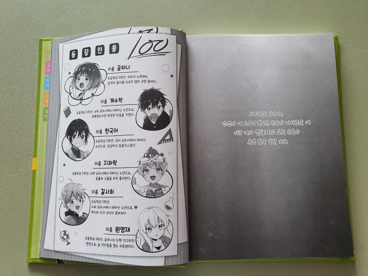 회장님이 먼저 책을 읽겠다며 펼쳐봤다가 '엄마~~'를 외치며 웃음 한가득 머금은 얼굴로 얘기합니다. '등장인물 이름이 다 웃겨!!!ㅋㅋㅋ' 알아보기 쉽게 이름을 지은 덕분에 내용의 흐름을 이해하는데 아주 쉽고 잊기 어려울 것 같은 생각이 드네요^^ 그리고 등장인물 소개 옆으로 쓰인 글은 딸이 어려워하는 과목도 앞으로 좋아지도록 수학 교과서 마지막 쪽 구석에 적어놓은 엄마의 주문입니다. 이것이 4개의 교과서가 4명의 소년이 된 시작이었습니다.