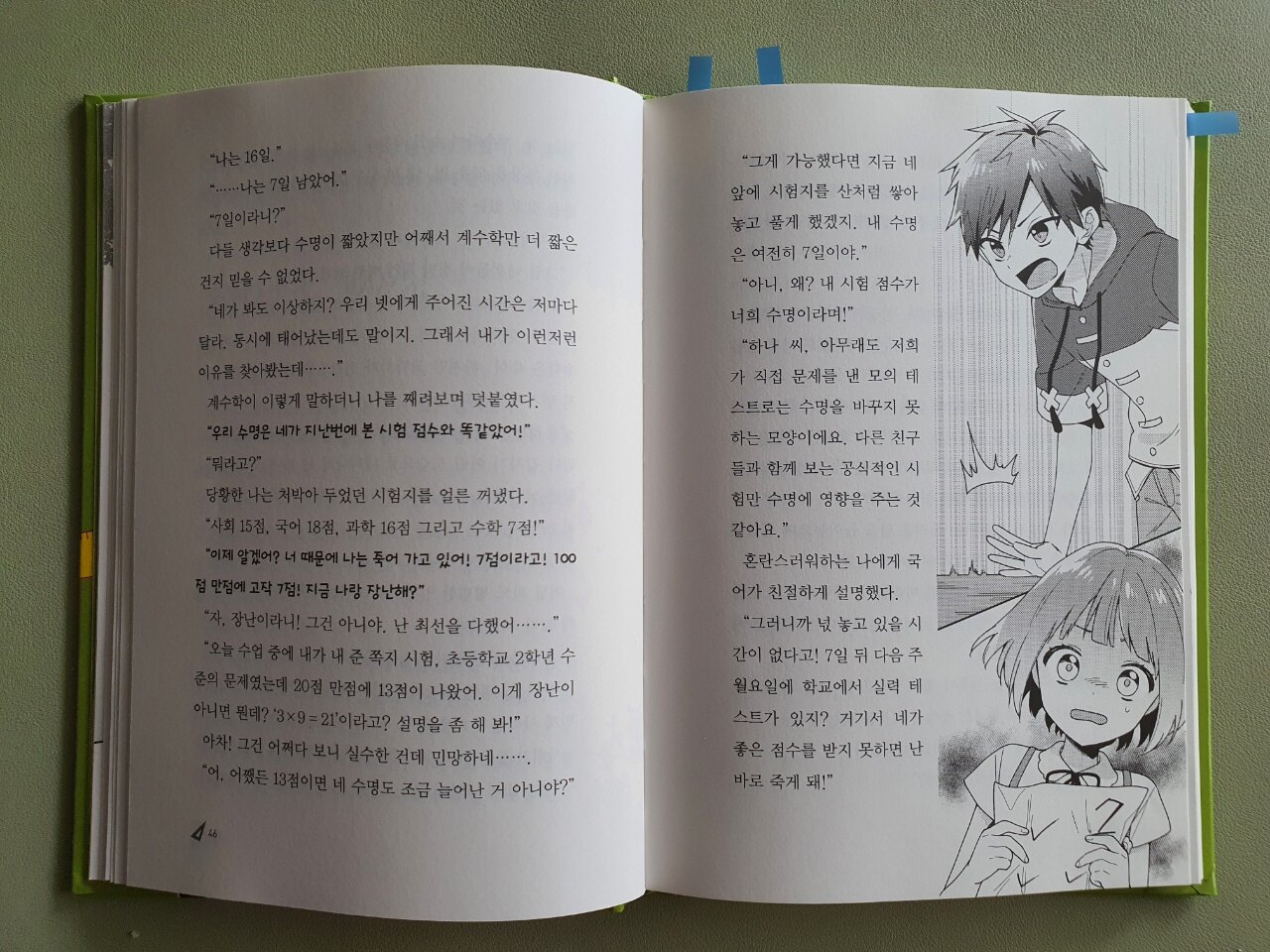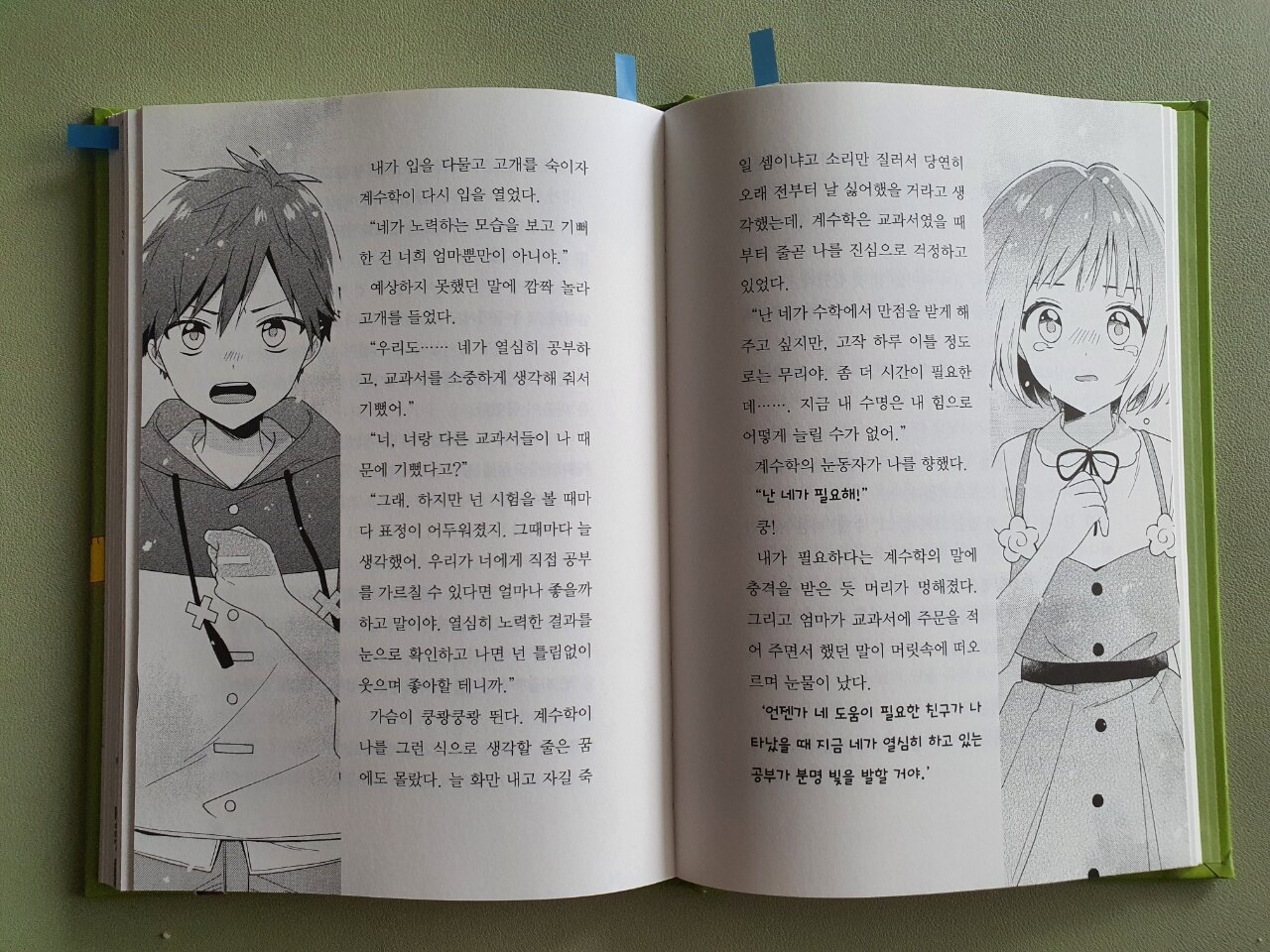 두근두근 성적 상승 로맨스 『시간표 소년』 첫 번째 이야기는 학교에서의 실력테스트를 마지막으로 이야기가 끝이 납니다. 물론 예상한 대로 하나의 성적은 기존 점수보다 높은 점수를 받게 되는데 2편으로 이어지는 예고편을 보니 가장 점수가 높았던 국어가 사라지는 위기에 처한 것 같네요.  뒷이야기가 너무너무 궁금해지는 호기심을 안고 책을 덮으며 2권을 기대하게 하네요.