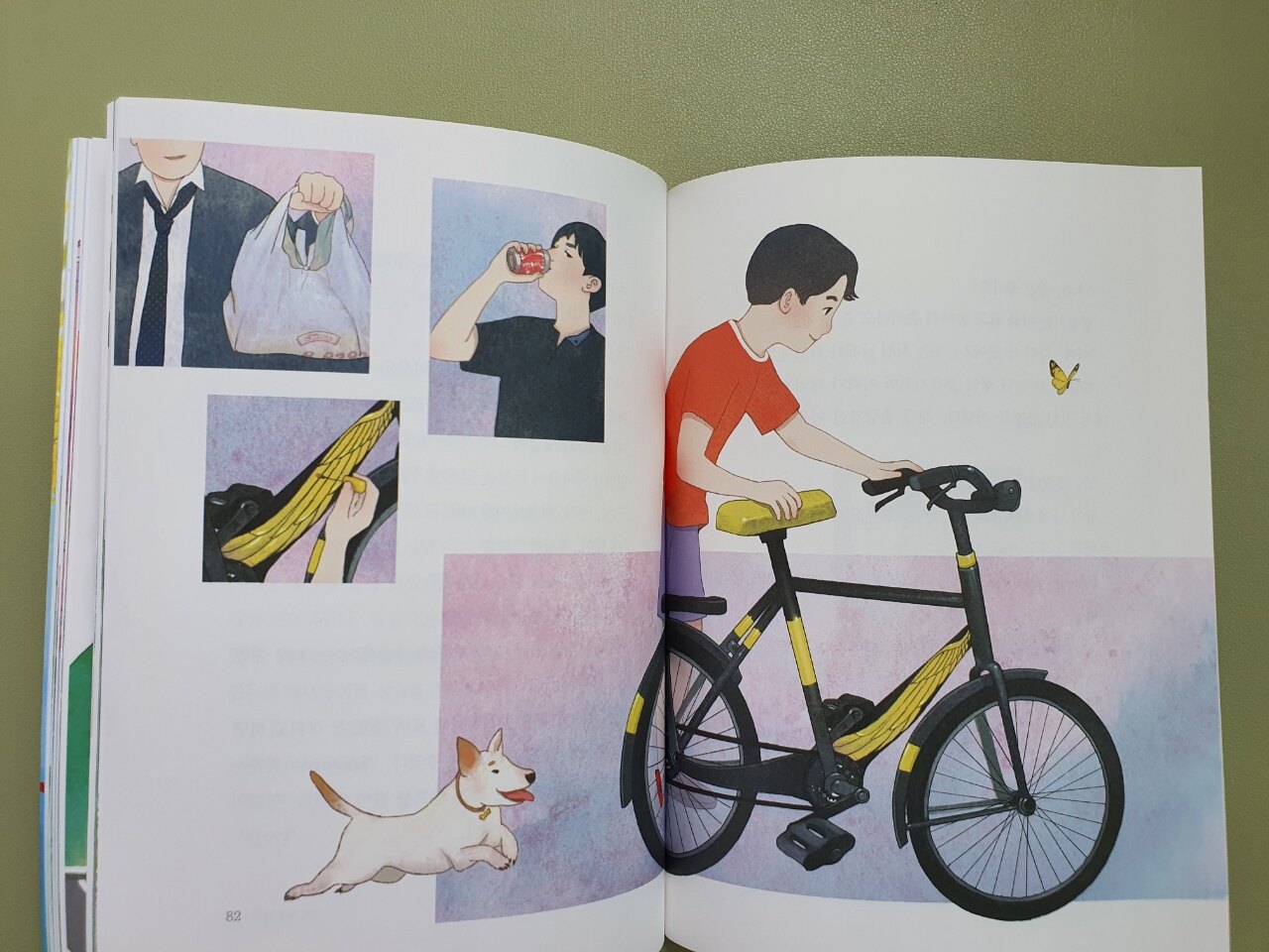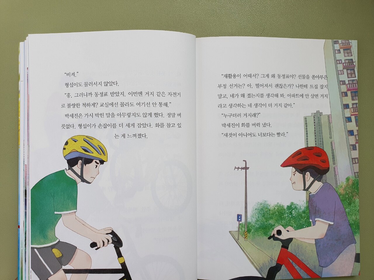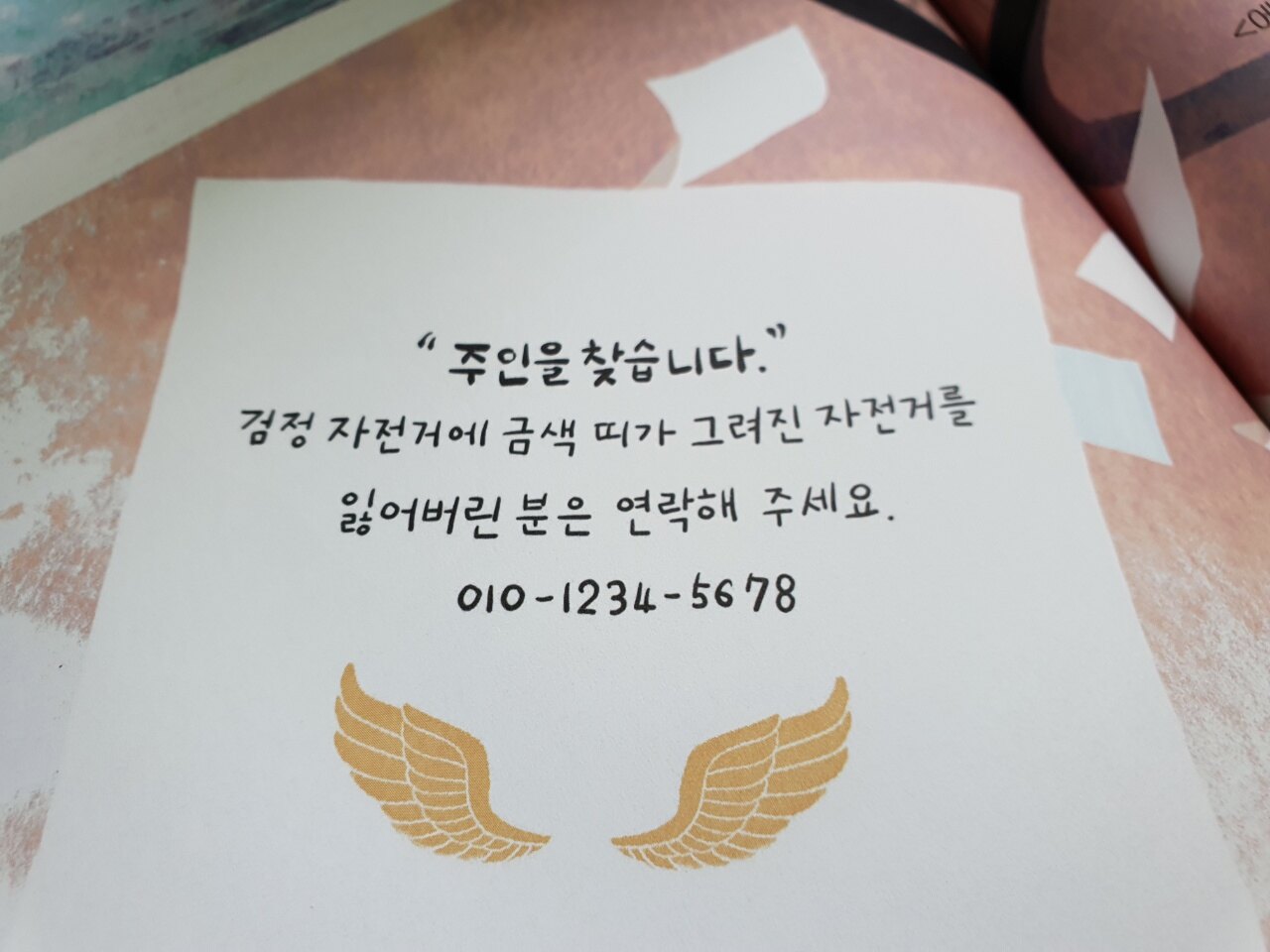 두부는 형섭이가 키우는 반려견이었습니다. 반려견 두부가 황금날개에게 소변을 보게 되고 미안해진 형섭이는 누가 봐도 버려진 듯한 자전거를 끌고 와 씻겨주기로 합니다. 형섭이에겐 형이 있고 그 형은 용이 그려진 자전거를 가지고 있습니다. 황금날개를 본 형은 다시 버려지기 싫은 황금날개의 마음을 전혀 눈치채지 못한 채 도둑으로 몰리면 안 된다며 제자리에 갖다 놓으라고 합니다. 하지만 사흘 동안 제자리에 있었던 황금날개를 수리하는 형섭이. 아무래도 버려진 자전거 황금날개에게 네 번째 주인이 생긴 것 같죠?^^