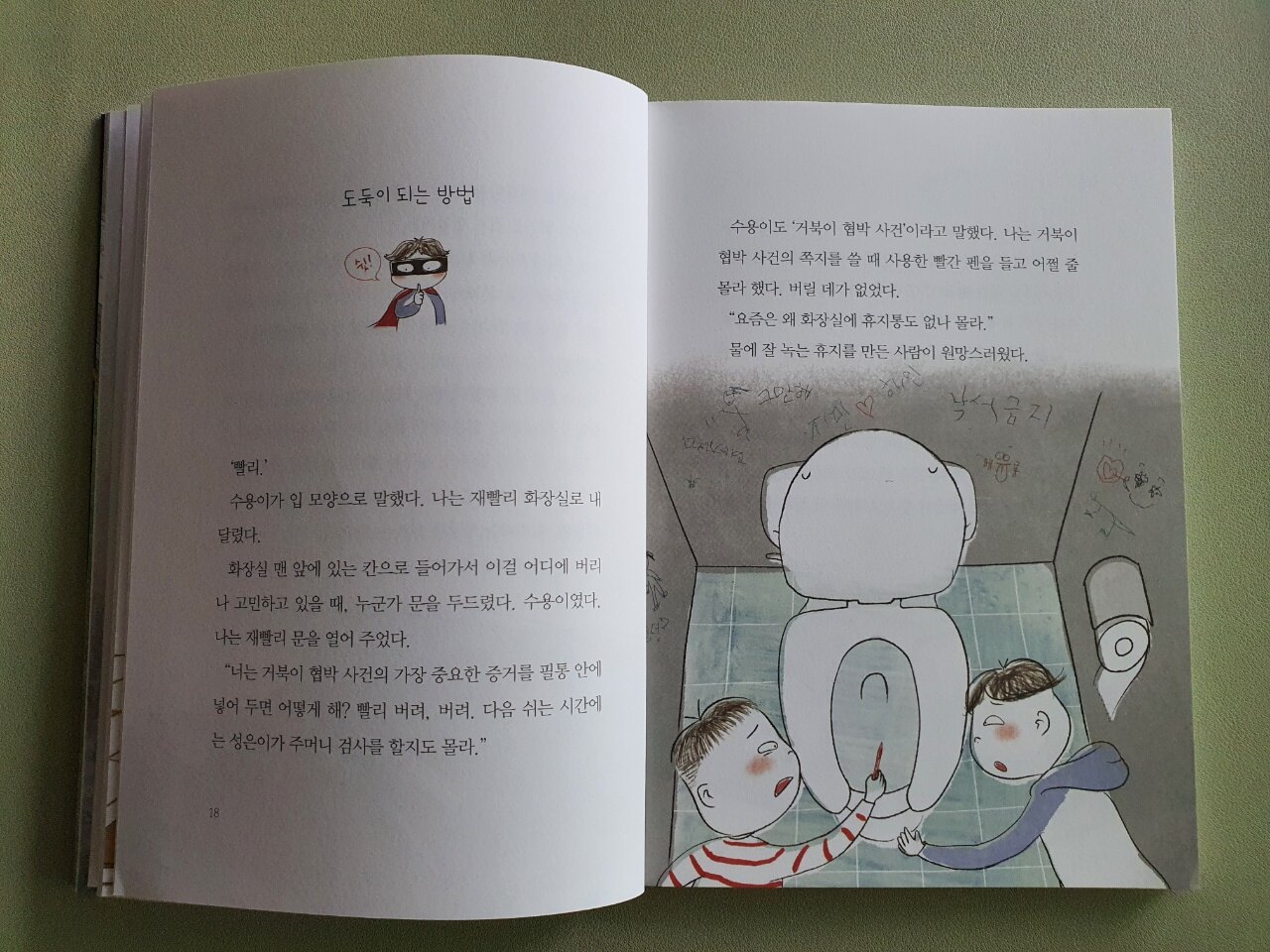 '상대방의 마음을 훔치는 기술'은 바로 '도둑이 되는 방법'이었습니다. 상대편의 비밀을 알고 있다고 말하고 죽을 때까지 지켜준다고 말하는 것인데요. 사실 비밀은 존재하지 않아도 상관없습니다. 어차피 지켜줄 것이기에 몰라도 상관없는 것이지요. 하지만 도룡이는 거북이의 비밀을 알고 있었습니다. 바로 학교에 제출하는 스마트폰 외에도 다른 스마트폰이 있어 화장실에서 몰래 하는 것을 본 적이 있었거든요. 아무에게도 말하지 않은 채 일단 수용이의 말대로 하게 되는 도룡이는 역시 예상대로 일이 잘 풀리진 않습니다. 성은이의 호들갑으로 용의자가 될 위기에 처한 도룡이! 하지만 수용이의 기지로 쪽지를 쓸 때 사용하던 빨간펜을 변기에 버리게 됩니다.