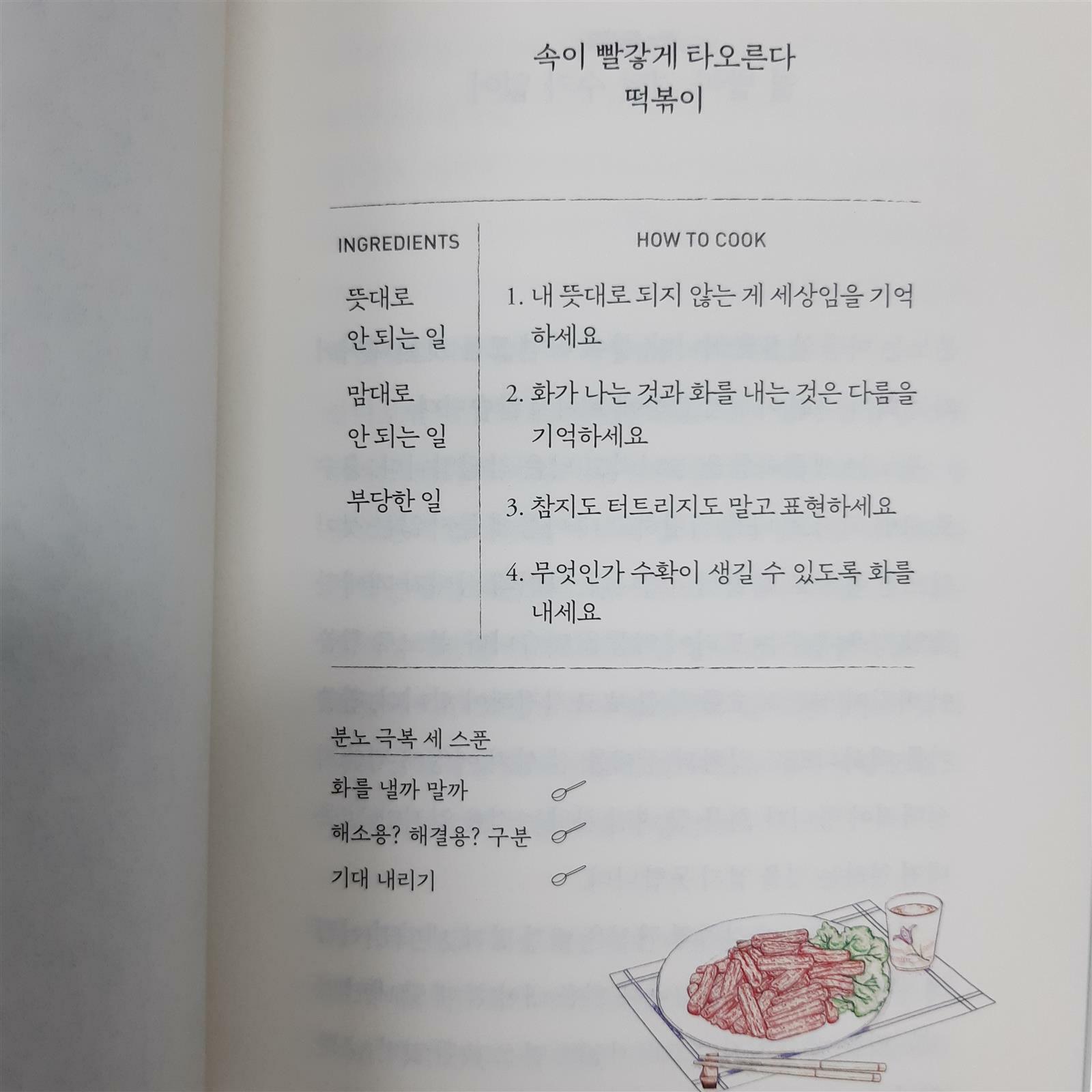 ~ 고통스러운 감정도 나를 살리기 위해 존재한다는 것을 알게 된다면, 이제 이 감정들의 ‘주인’이 되기 위한 연습이 필요하다. 스스로를 ‘감정식당의 셰프’라고 칭하는 저자 이서원은 어떻게 요리하느냐에 따라 음식의 맛이 달라지듯, 감정도 어떻게 요리하느냐에 따라 그 ‘맛’이 달라진다고 설명한다. 가령 쓰디쓴 맛이 나는 불안도 잘만 요리하면 계란말이처럼 부드럽고 고소한 맛으로 느껴질 수 있다. 이렇게 감정을 맛있게 요리할 수 있게 되는 순간이 내 감정의 ‘주인’이 되는 순간이다.