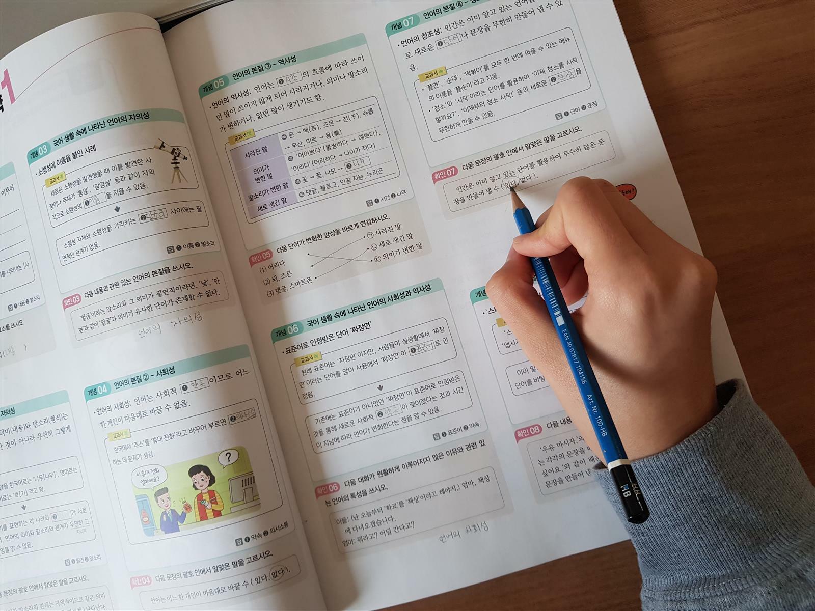 처음에는 어려워하면 중학 국어 문법을 풀어 나가는 모습이에요