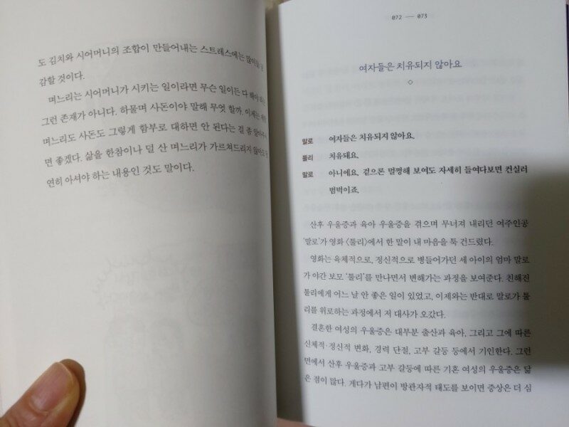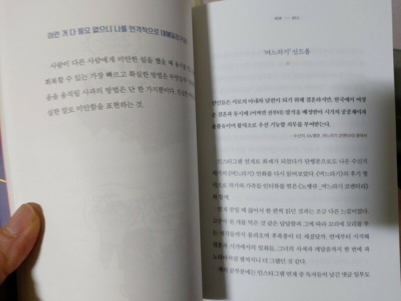 님아 그 선을 넘지마오라는 책제목이 인상적이었어요 며느리와 시어머니 관계는 쉽지만은 않은 관계라 그 안에서 서로에게 은연중에 상처가 되기도 하지요 한국에서는 며느리입장이 쉽지않은 게 사실이에요 고부관계보다 더 중요한 것은 그 사이에 있는 남편의 행동이에요 지원군이냐 아니냐에 따라 관계도 달라지게 되요 며느라기 웹툰 한참 유행일 때 즐겨 봤었는데 며느리의 힘듦이 잘 드러나서 많은 공감을 받았더랬죠 한국에서 여성은 '결혼과 동시에 말석을 배정받아 시가의 공공재이자 윤활유이며, 활력소로 기능할 의무를 부여받는' 현실을 기가 막히게 잘 반영한 에피소드에요 여자에게 한 번 생긴 상처는 눈속임으로 가릴 수는 있을지 몰라도 본질적으로 치유되기 힘들다는 이야기는 공감이 많이 되었어요 특히 임신과 출산 때의 상처는 잊혀지지 않는 듯 해요 말로써 받는 상처도 참으로 크게 작용하는 것 같아요 남자들은 결혼해서도 아내가 계속 착한여자로 남기로 바라는데 남자가 생각하는 착한 여자는 예민한 여자의 반대편 네네하고 순종적인 여자를 말하는 듯 해요 부당하고 불합리한 것, 불편한 것에 대해 당당히 말하는 것은 예민한게 아니라 자기 생각을 똑바로 말할 수 있는 좋은 능력이라는 말이 와 닿았어요 같은 여자이면서 시자가 들어가기 시작한 순간 변하게 되는지 의문이에요 저도 남동생이 있어 시누이가 될텐데 마음은 착한시누이인데 막상 되면 변할런지 시자의 망령이 사라지길 바랄 뿐이에요 책에 나온 딸가진 시어머니도 딸과 며느리를 다르게 대하는 것을 보면 같은여자라고 공감하고 똑같이 대하는 것만은 아닌 듯 해요 한 사람을 세트로 받아들인다는 것에서 느낀 점이 많네요 단점은 고치고 싶어했지 단점까지 그 사람으로 받아들이는 것은 쉽지 않은 것 같아요 한 사람의 모든 부분을 세트로 받아들일 때 두 사람간의 관계는 더욱 단단해질 것 같네요 내 남편의 가치는 연봉이 아니라 오로지 아내를 위한 변함없는 다정함과 사랑의 능력을 보여줄 때 입증된다는 말이 찡하네요