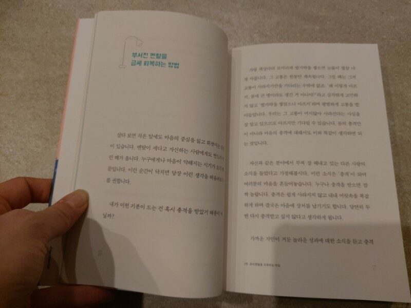인간관계는 복잡하기도 하고 미묘해서 그 사이에서 오는 스트레스가 큰 것 같아요 그 밖에도 생각이 너무 많아서 오히려 자신에게 독이 되는 경우도 있더라구요 멘탈이 너덜너덜해져서 하루를 시작할 힘도 나지 않을 때 멘탈을 회복시킬 유리멘탈을 위한 심리책을 읽어 보았어요^^ 부서진 멘탈을 금방 회복하는 방법이 무척 궁금해서 목차에서 보고 바로 읽어 보았어요 부럽거나 충격받을 얘기를 들으면 한동안 그 생각에 사로잡혀서 자신을 힘들게 하는 것 같아요 그냥 그 충격을 인정하고 평범한 반응으로 인정하면 충격으로 인한 고통이 머지않아 사라지게 되네요 다른 사람 때문에 마음이 힘들면 보통 참아왔었는데 최악의 선택이더라구요 피해의식에서 벗어나기 위한 가장 도움이 되는 방법은 상대에게 상대만의 사정이 있다고 생각하는 것이에요 그냥 그렇게 생각하니 피해자라는 관점에서 벗어나게 되더라구요 화를 내는 사람이 있을 땐 왜 나한테 화를 내지 하고 짜증이 나고 상대를 좋지 않게 바라보다가 어려움에 처한 상대가 비명을 지르는 것이라고 생각하니 생각이 바뀌더라구요 생각을 바꾼 것 만으로도 원만한 인간관계에 도움이 되네요 소중한 친구에게는 격려와 따뜻한 말을 해주면서도 자기자신에게는 해 주지 못했었네요 자기자신에게는 부정적으로 이야기하면서도 인지하지 못했었는데 자기자신도 위로가 되는 것을 느꼈어요 지나간 일을 책망해봤자 회복이 늦어지게 되네요 그냥 뭐 어떻게든 되겠지라는 생각이 멘탈을 단단하게 해 주어요 이런 생각이 쉽게 들지는 않지만 생각이 들도록 하다보면 회복도 훨씬 빨라질 것 같아요 참 쓸데없는 걱정으로 보낸 시간이 많더라구요 아직 일어나지도 않은 일을 걱정하고 신경쓰다보니 마음도 지치고 힘들게 되는 것 같아요 앞날을 걱정하면 쓸데없는 데 에너지를 쓸 뿐이라는 말이 와 닿네요 도서를 협찬받아 주관적인 견해에 의해 작성했습니다 #유리멘탈을위한심리책, #자기계발서, #갤리온